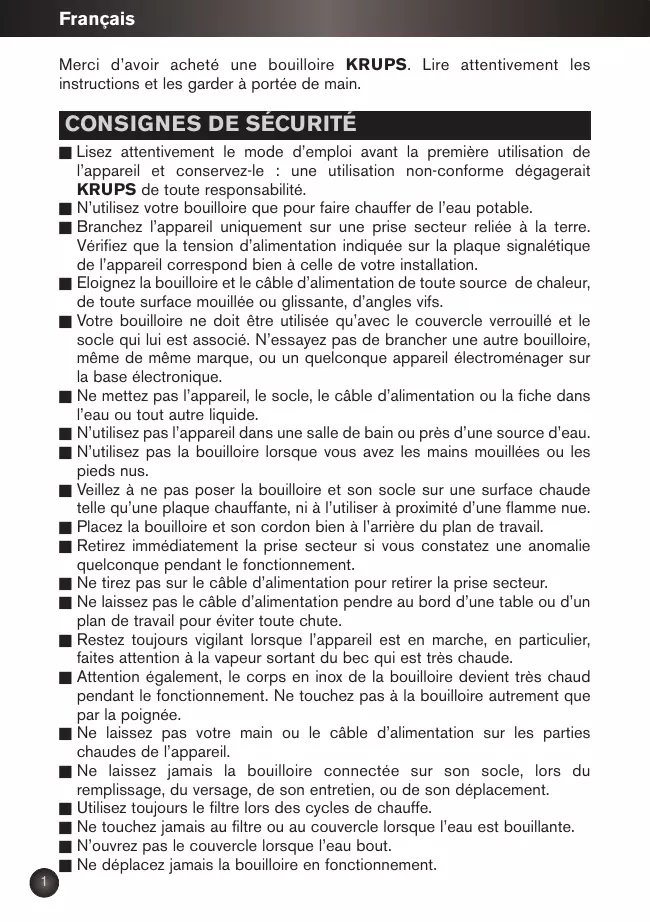 ■ Lisez attentivement le mode d'emploi avant la première utilisation de l'appareil et conservez-le : une utilisation non-conforme dégagerait KRUPS de toute responsabilité. N'utilisez votre bouilloire que pour faire chauffer de l'eau potable. ■ Branchez l'appareil uniquement sur une prise secteur reliée à la terre. Vérifiez que la tension d'alimentation indiquée sur la plaque signalétique de l'appareil correspond bien à celle de votre installation. Éloignez la bouilloire et le câble d'alimentation de toute source de chaleur, de toute surface mouillée ou glissante, d'angles vifs. Votre bouilloire ne doit être utilisée qu'avec le couvercle verrouillé et le socle qui lui est associé. N'essayez pas de brancher une autre bouilloire, même de même marque, ou un quelconque appareil électroménager sur la base électronique. Ne mettez pas l'appareil, le socle, le câble d'alimentation ou la fiche dans l'eau ou tout autre liquide. N'utilisez pas l'appareil dans une salle de bain ou près d'une source d'eau. N'utilisez pas la bouilloire lorsque vous avez les mains mouillées ou les pieds nus. Veillez à ne pas poser la bouilloire et son socle sur une surface chaude telle qu'une plaque chauffante, ni à l'utiliser à proximité d'une flamme nue. Placez la bouilloire et son cordon bien à l'arrêt du plan de travail. Retirez immédiatement la prise secteur si vous constatez une anomalie quelconque pendant le fonctionnement. Ne tirez pas sur le câble d'alimentation pour retirer la prise secteur. Ne laissez pas le câble d'alimentation pendre au bord d'une table ou d'un plan de travail pour éviter toute chute. Restez toujours vigilant lorsque l'appareil est en marche, en particulier, faites attention à la vapeur sortant du bec qui est très chaude. Attention également, le corps en inox de la bouilloire devient très chaud pendant le fonctionnement. Ne touchez pas à la bouilloire autrement que par la poignée. Ne laissez pas votre main ou le câble d'alimentation sur les parties chaudes de l'appareil. Ne laissez jamais la bouilloire connectée sur son socle, lors du remplissage, du versement, de son entretien, ou de son déplacement. Utilisez toujours le filtre lors des cycles de chauffe. Ne touchez jamais au filtre ou au couvercle lorsque l'eau est bouillante. N'ouvrez pas le couvercle lorsque l'eau bout. Ne déplacez jamais la bouilloire en fonctionnement.