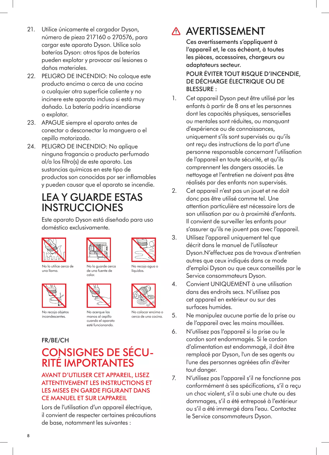21. Utilisez uniquement un modèle de chargeur Dyson de numéros de série 217160 ou 270576 pour recharger l’appareil Dyson. Utilisez uniquement des batteries Dyson : d’autres types de batteries risquent d’exploser et de provoquer des blessures corporelles et autres dommages. 22. RISQUE D’INCENDIE – Ne placez pas ce produit sur (ou à proximité) d’une cuisinière ou autre surface chaude et ne l’incinérez pas même s’il est fortement endommagé. La batterie risque de prendre feu ou d’exploser. 23. Éteignez toujours l’appareil avant de clipser ou de retirer la brosse motorisée. 24. RISQUE D’INCENDIE – N’appliquez pas de parfum ou de produit parfumé sur le ou les filtres de cet appareil. Les substances chimiques contenues dans ces produits sont connues pour leur caractère inflammable et peuvent enflammer l’appareil.