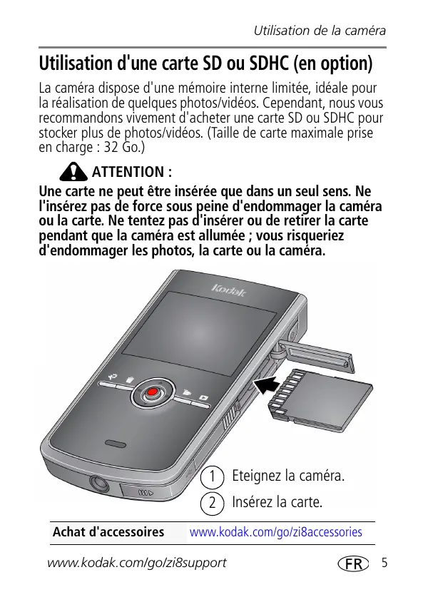 www.kodak.com/go/easysharecenter Utilisation de la caméra Utilisation d'une carte SD ou SDHC (en option) La caméra dispose d'une mémoire interne limitée, idéale pour la réalisation de quelques photos/vidéos. Cependant, nous vous recommandons vivement d'acheter une carte SD ou SDHC pour stocker plus de photos/vidéos. (Taille de carte maximale prise en charge : 32 Go.) ATTENTION : Une carte ne peut être insérée que dans un seul sens. Ne l'insérez pas de force sous peine d'endommager la caméra ou la carte. Ne tentez pas d'insérer ou de retirer la carte pendant que la caméra est allumée ; vous risqueriez d'endommager les photos, la carte ou la caméra. 1 Eteignez la caméra. 2 Insérez la carte. Achat d'accessoires www.kodak.com/go/zi8accessories www.kodak.com/go/zi8support
