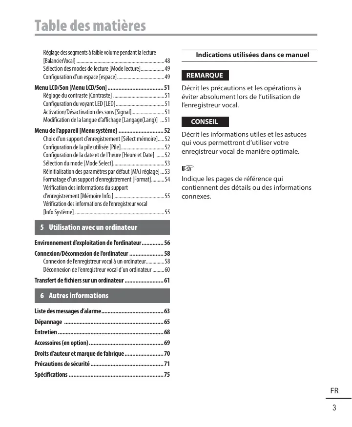 - Vérification des informations de l’enregistreur vocal [Info Système] Indications utilisées dans ce manuel REMARQUE Décrit les précautions et les opérations à éviter absolument lors de l’utilisation de l’enregistreur vocal. CONSEIL Décrit les informations utiles et les astuces qui vous permettront d’utiliser votre enregistreur vocal de manière optimale. p. 55