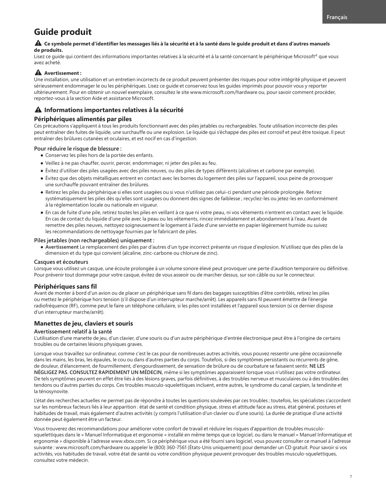 Lorsque vous travaillez sur ordinateur, comme c’est le cas pour de nombreuses autres activités, vous pouvez ressentir une gêne occasionnelle dans les mains, les bras, les épaules, le cou ou dans d’autres parties du corps. Toutefois, si des symptômes persistants ou récurrents de gêne, de douleur, d’élancement, de fourmillement, d’engourdissement, de sensation de brûlure ou de courbature se faisaient sentir, NE LES NÉGLIGEZ PAS. CONSULTEZ RAPIDEMENT UN MÉDECIN, même si les symptômes apparaissent lorsque vous n’utilisez pas votre ordinateur. De tels symptômes peuvent en effet être liés à des lésions graves, parfois définitives, à des troubles nerveux et musculaires ou à des troubles des tendons ou d’autres parties du corps. Ces troubles musculo-squelettiques incluent, entre autres, le syndrome du canal carpien, la tendinite et la ténosynovite. L’état des recherches actuelles ne permet pas de répondre à toutes les questions soulevées par ces troubles ; toutefois, les spécialistes s’accordent sur les nombreux facteurs liés à leur apparition : état de santé et condition physique, stress et attitude face au stress, état général, postures et habitudes de travail, mais également d’autres activités (y compris l’utilisation d’un clavier ou d’une souris). La durée de pratique d’une activité donnée peut également être un facteur. Vous trouverez des recommandations pour améliorer votre confort de travail et réduire les risques d’apparition de troubles musculosquelettiques dans le « Manuel Informatique et ergonomie » installé en même temps que ce logiciel, ou dans le manuel « Manuel Informatique et ergonomie » disponible à l’adresse www.xbox.com. Si ce périphérique vous a été fourni sans logiciel, vous pouvez consulter ce manuel à l’adresse suivante : www.microsoft.com/hardware ou appeler le (800) 360-7561 (États-Unis uniquement) pour demander un CD gratuit. Pour savoir si vos activités, vos habitudes de travail, votre état de santé ou votre condition physique peuvent provoquer des troubles musculo-squelettiques, consultez votre médecin. 7