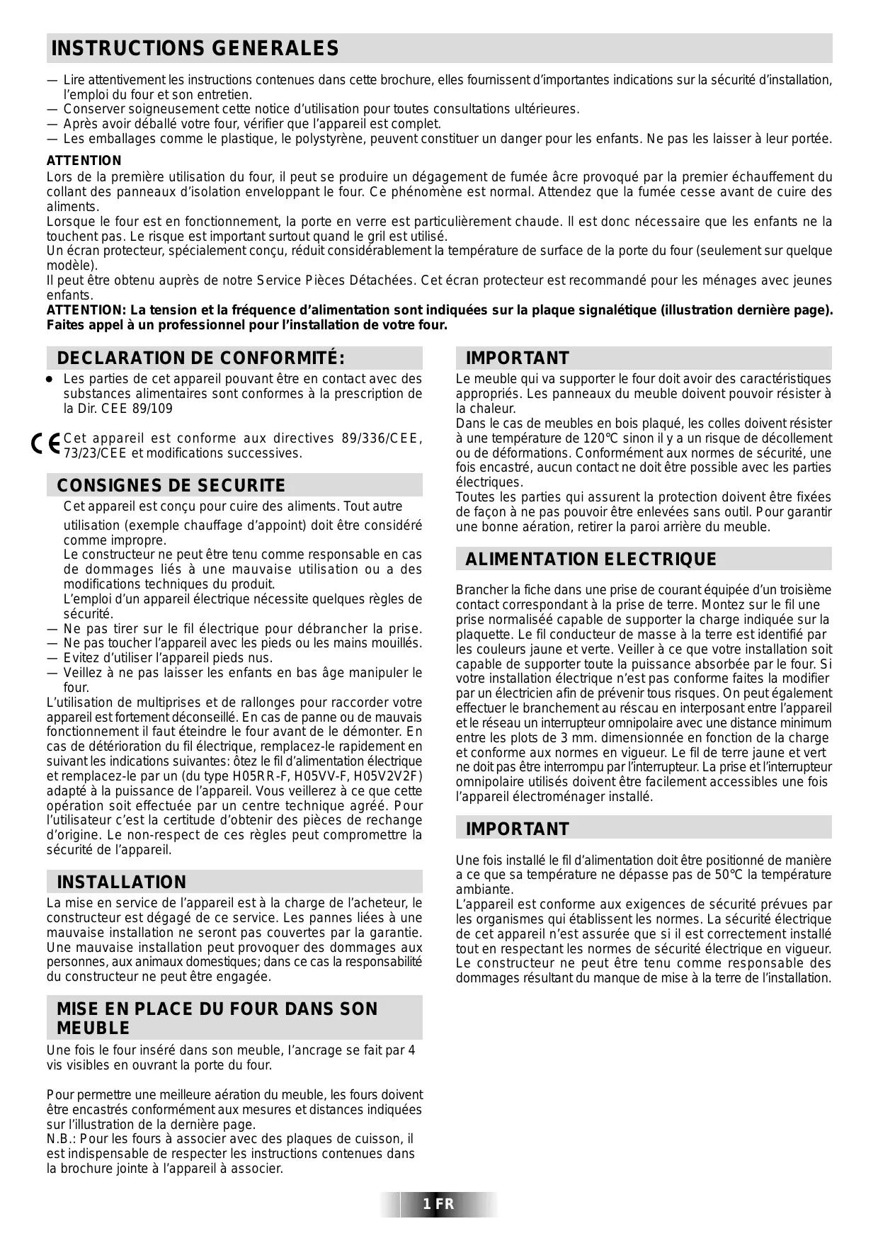 INSTRUCTIONS GENERALES — Lire attentivement les instructions contenues dans cette brochure, elles fournissent d’importantes indications sur la sécurité d’installation, l’emploi du four et son entretien. — Conserver soigneusement cette notice d’utilisation pour toutes consultations ultérieures. — Après avoir déballé votre four, vérifier que l’appareil est complet. — Les emballages comme le plastique, le polystyrène, peuvent constituer un danger pour les enfants. Ne pas les laisser à leur portée. ATTENTION Lors de la première utilisation du four, il peut se produire un dégagement de fumée âcre provoqué par la premier échauffement du collant des panneaux d’isolation enveloppant le four. Ce phénomène est normal. Attendez que la fumée cesse avant de cuire des aliments. Lorsque le four est en fonctionnement, la porte en verre est particulièrement chaude. ll est donc nécessaire que les enfants ne la touchent pas. Le risque est important surtout quand le gril est utilisé. Un écran protecteur, spécialement conçu, réduit considérablement la température de surface de la porte du four (seulement sur quelque modèle). Il peut être obtenu auprès de notre Service Pièces Détachées. Cet écran protecteur est recommandé pour les ménages avec jeunes enfants. ATTENTION: La tension et la fréquence d’alimentation sont indiquées sur la plaque signalétique (illustration dernière page). Faites appel à un professionnel pour l’installation de votre four. DECLARATION DE CONFORMITÉ: IMPORTANT