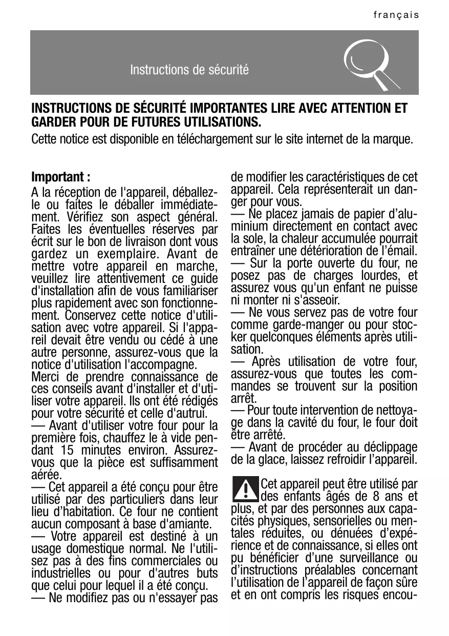 français Instructions de sécurité INSTRUCTIONS DE SÉCURITÉ IMPORTANTES LIRE AVEC ATTENTION ET GARDER POUR DE FUTURES UTILISATIONS. Cette notice est disponible en téléchargement sur le site internet de la marque. Important : A la réception de l'appareil, déballezle ou faites le déballer immédiatement. Vérifiez son aspect général. Faites les éventuelles réserves par écrit sur le bon de livraison dont vous gardez un exemplaire. Avant de mettre votre appareil en marche, veuillez lire attentivement ce guide d'installation afin de vous familiariser plus rapidement avec son fonctionnement. Conservez cette notice d'utilisation avec votre appareil. Si l'appareil devait être vendu ou cédé à une autre personne, assurez-vous que la notice d'utilisation l'accompagne. Merci de prendre connaissance de ces conseils avant d'installer et d'utiliser votre appareil. Ils ont été rédigés pour votre sécurité et celle d'autrui. — Avant d'utiliser votre four pour la première fois, chauffez le à vide pendant 15 minutes environ. Assurezvous que la pièce est suffisamment aérée. — Cet appareil a été conçu pour être utilisé par des particuliers dans leur lieu d’habitation. Ce four ne contient aucun composant à base d'amiante. — Votre appareil est destiné à un usage domestique normal. Ne l'utilisez pas à des fins commerciales ou industrielles ou pour d'autres buts que celui pour lequel il a été conçu. — Ne modifiez pas ou n'essayer pas de modifier les caractéristiques de cet appareil. Cela représenterait un danger pour vous. — Ne placez jamais de papier d’aluminium directement en contact avec la sole, la chaleur accumulée pourrait entraîner une détérioration de l’émail. — Sur la porte ouverte du four, ne posez pas de charges lourdes, et assurez vous qu'un enfant ne puisse ni monter ni s'asseoir. — Ne vous servez pas de votre four comme garde-manger ou pour stocker quelconques éléments après utilisation. — Après utilisation de votre four, assurez-vous que toutes les commandes se trouvent sur la position arrêt. — Pour toute intervention de nettoyage dans la cavité du four, le four doit être arrêté. — Avant de procéder au déclippage de la glace, laissez refroidir l’appareil. Cet appareil peut être utilisé par des enfants âgés de 8 ans et plus, et par des personnes aux capacités physiques, sensorielles ou mentales réduites, ou dénuées d’expérience et de connaissance, si elles ont pu bénéficier d’une surveillance ou d’instructions préalables concernant l’utilisation de l’appareil de façon sûre et en ont compris les risques encou- français rus. Les enfants ne doivent pas jouer avec l’appareil. Les opérations de nettoyage et de maintenance ne doivent pas être faites par des enfants laissés sans surveillance. — Il convient de surveiller les enfants pour s’assurer qu’ils ne jouent pas avec l’appareil. MISE EN GARDE : L’appareil et ses parties accessibles deviennent chaudes au cours de l’utilisation. Faire attention à ne pas toucher les éléments chauffants situés à l’intérieur du four. Les enfants de moins de 8 ans doivent être tenus à l’écart à moins qu’ils ne soient surveillés en permanence. — Cet appareil est conçu pour faire des cuissons porte fermée. — Avant de procéder à un nettoyage pyrolyse de votre four, retirez tous les accessoires et enlevez les éclaboussures importantes. — Dans la fonction de nettoyage, les surfaces peuvent devenir plus chaudes qu'en usage normal. Il est recommandé d'éloigner les enfants. — Ne pas utiliser d’appareil de nettoyage à la vapeur. — Avant de retirer la paroi du fond, l'appareil doit être mis hors tension. Après le nettoyage, le protecteur doit être remis en place conformément aux instructions. — Ne pas utiliser de produits d’entretien abrasifs ou de grattoirs métalliques durs pour nettoyer la porte en verre du four, ce qui pourrait érafler la surface et entraîner l’éclatement du verre. MISE EN GARDE : S'assurer que l'appareil est déconnecté de l'alimentation avant de remplacer la lampe pour éviter tout risque de choc électrique. Intervenez lorsque l'appareil est refroidi. Pour devisser le hublot et la lampe, utilisez un gant de caoutchouc qui facilitera le démontage. La fiche de prise de courant doit être accessible après installation. Il doit être possible de déconnecter l'appareil du réseau d'alimentation, soit à l'aide d'une fiche de prise de courant, soit en incorporant un interrupteur dans les canalisations fixes conformément aux règles d’installation. Si le câble d'alimentation est endommagé, il doit être remplacé par le fabricant, son service après vente ou une personne de qualification similaire afin d'éviter un danger. — Cet appareil peut être installé indifféremment sous plan ou en colonne comme indiqué sur le schéma d'installation. — Centrez le four dans le meuble de façon à garantir une distance minimum de 10 mm avec le meuble voisin. La matière du meuble d'encastrement doit résister à la chaleur (ou être revêtu d'une telle matière). Pour plus de stabilité, fixez le four dans le meuble par 2 vis au travers des trous prévus à cet effet sur les montants latéraux. — L'appareil ne doit pas être installé derrière une porte décorative, afin d'éviter une surchauffe. français
