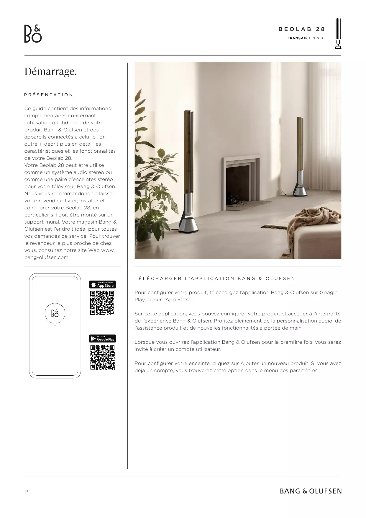 & Olufsen. Lors de la première configuration, assurez-vous que le produit est connecté au réseau et que le logiciel a été mis à jour avant toute connexion à votre téléviseur Bang & Olufsen. Tout se fait par l’intermédiaire de l’application Bang & Olufsen. Pendant la configuration d’une paire stéréo avec vos Beolab 28, vérifiez que tous les câbles d’entrée sont connectés à la même enceinte, laquelle doit être définie comme enceinte principale de la paire.