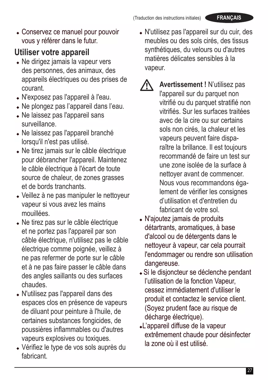 Avertissement ! N’utilisez pas l'appareil sur du parquet non vitrifié ou du parquet stratifié non vitrifiés. Sur les surfaces traitées avec de la cire ou sur certains sols non cirés, la chaleur et les vapeurs peuvent faire disparaître la brillance. Il est toujours recommandé de faire un test sur une zone isolée de la surface à nettoyer avant de commencer. Nous vous recommandons également de vérifier les consignes d’utilisation et d'entretien du fabricant de votre sol. u N'ajoutez jamais de produits détartrants, aromatiques, à base d'alcool ou de détergents dans le nettoyeur à vapeur, car cela pourrait l'endommager ou rendre son utilisation dangereuse. u Si le disjoncteur se déclenche pendant l’utilisation de la fonction Vapeur, cessez immédiatement d'utiliser le produit et contactez le service client. (Soyez prudent face au risque de décharge électrique). uL’appareil diffuse de la vapeur extrêmement chaude pour désinfecter la zone où il est utilisé. 27