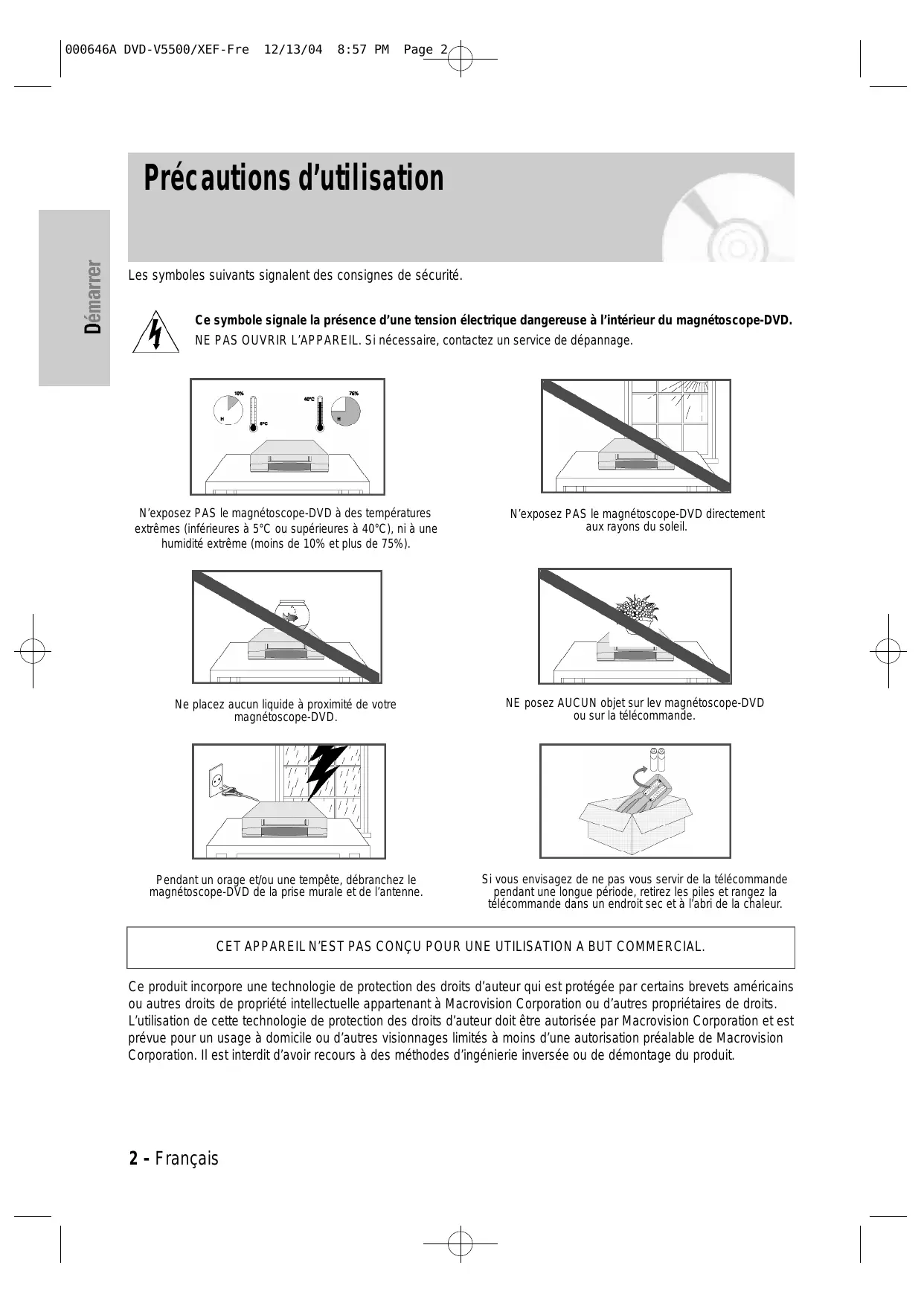 000646A DVD-V5500/XEF-Fre 12/13/04 8:57 PM Page 1 Manuel d’utilisation DVD-V5500 DVD-V6500 PAL/SECAM www.samsung.fr 000646A DVD-V5500/XEF-Fre 12/13/04 8:57 PM Page 2 Précautions d’utilisation Les symboles suivants signalent des consignes de sécurité. Ce symbole signale la présence d’une tension électrique dangereuse à l’intérieur du magnétoscope-DVD. NE PAS OUVRIR L’APPAREIL. Si nécessaire, contactez un service de dépannage. N’exposez PAS le magnétoscope-DVD à des températures extrêmes (inférieures à 5°C ou supérieures à 40°C), ni à une humidité extrême (moins de 10% et plus de 75%). N’exposez PAS le magnétoscope-DVD directement aux rayons du soleil. Ne placez aucun liquide à proximité de votre magnétoscope-DVD. NE posez AUCUN objet sur lev magnétoscope-DVD ou sur la télécommande. Pendant un orage et/ou une tempête, débranchez le magnétoscope-DVD de la prise murale et de l’antenne. Si vous envisagez de ne pas vous servir de la télécommande pendant une longue période, retirez les piles et rangez la télécommande dans un endroit sec et à l’abri de la chaleur. CET APPAREIL N’EST PAS CONÇU POUR UNE UTILISATION A BUT COMMERCIAL. Ce produit incorpore une technologie de protection des droits d’auteur qui est protégée par certains brevets américains ou autres droits de propriété intellectuelle appartenant à Macrovision Corporation ou d’autres propriétaires de droits. L’utilisation de cette technologie de protection des droits d’auteur doit être autorisée par Macrovision Corporation et est prévue pour un usage à domicile ou d’autres visionnages limités à moins d’une autorisation préalable de Macrovision Corporation. Il est interdit d’avoir recours à des méthodes d’ingénierie inversée ou de démontage du produit.