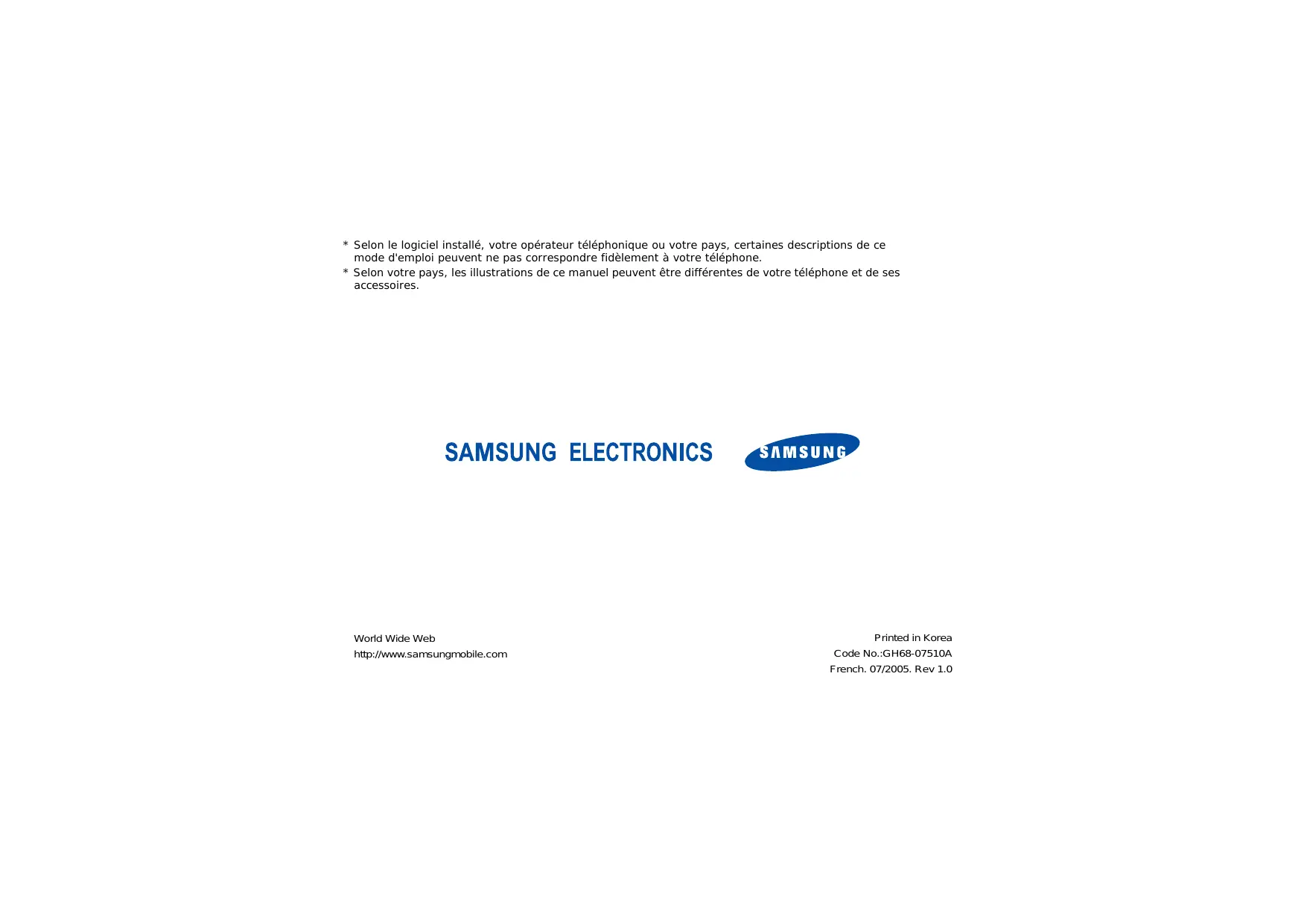 - Selon votre pays, les illustrations de ce manuel peuvent être différentes de votre téléphone et de ses accessoires. World Wide Web http://www.samsungmobile.com Printed in Korea Code No.:GH68-07510A French. 07/2005. Rev 1.0 SGH-Z300 Mode d’emploi N'utilisez jamais votre téléphone en conduisant. Garez votre véhicule avant d’utiliser un téléphone en prise directe. Eteignez votre téléphone lorsque vous effectuez le plein de votre véhicule. Consignes de sécurité importantes Avant de vous servir de votre téléphone mobile, lisez les consignes de sécurité suivantes, afin d’éviter toute utilisation dangereuse ou frauduleuse de votre téléphone. N’utilisez pas votre téléphone lorsque vous vous trouvez dans une station d'essence ou à proximité de produits combustibles ou chimiques. Eteignez votre téléphone en avion. Les téléphones mobiles peuvent engendrer des interférences. Leur utilisation en avion est interdite et dangereuse. Eteignez votre téléphone à proximité de tout équipement médical électronique. Eteignez votre téléphone à proximité d’équipements médicaux. Les équipements utilisés dans les hôpitaux et les unités de soins sont sensibles aux radiofréquences. Respectez la législation ou la réglementation en vigueur. Interférences Tous les téléphones mobiles peuvent être sujets à des interférences susceptibles d’affecter leurs performances. Ne laissez pas le téléphone à la portée des enfants en bas âge. Conservez le téléphone, ses pièces détachées et ses accessoires hors de portée des enfants. Accessoires et batteries Respectez les réglementations spécifiques en vigueur à l’endroit où vous vous trouvez et éteignez toujours votre téléphone lorsque son utilisation est interdite ou lorsqu'il est susceptible de générer des interférences ou d’être une source de danger. Utilisez uniquement des accessoires et des batteries Samsung. L’emploi de tout accessoire non autorisé pourrait endommager votre téléphone et s'avérer dangereux. Etanchéité Votre téléphone n’est pas étanche. Gardez-le au sec. Utilisation normale