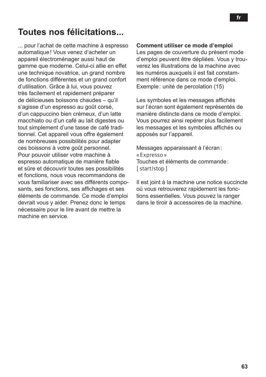 Toutes nos félicitations... ... pour l’achat de cette machine à espresso automatique ! Vous venez d’acheter un appareil électroménager aussi haut de gamme que moderne. Celui-ci allie en effet une technique novatrice, un grand nombre de fonctions différentes et un grand confort d’utilisation. Grâce à lui, vous pouvez très facilement et rapidement préparer de délicieuses boissons chaudes – qu’il s’agisse d’un espresso au goût corsé, d’un cappuccino bien crémeux, d’un latte macchiato ou d’un café au lait digestes ou tout simplement d’une tasse de café traditionnel. Cet appareil vous offre également de nombreuses possibilités pour adapter ces boissons à votre goût personnel. Pour pouvoir utiliser votre machine à espresso automatique de manière fiable et sûre et découvrir toutes ses possibilités et fonctions, nous vous recommandons de vous familiariser avec ses différents composants, ses fonctions, ses affichages et ses éléments de commande. Ce mode d’emploi devrait vous y aider. Prenez donc le temps nécessaire pour le lire avant de mettre la machine en service. Comment utiliser ce mode d’emploi Les pages de couverture du présent mode d’emploi peuvent être dépliées. Vous y trouverez les illustrations de la machine avec les numéros auxquels il est fait constamment référence dans ce mode d’emploi. Exemple : unité de percolation (15) Les symboles et les messages affichés sur l’écran sont également représentés de manière distincte dans ce mode d’emploi. Vous pourrez ainsi repérer plus facilement les messages et les symboles affichés ou apposés sur l’appareil. Messages apparaissant à l’écran : « Expresso » Touches et éléments de commande : Il est joint à la machine une notice succincte où vous retrouverez rapidement les fonctions essentielles. Vous pouvez la ranger dans le tiroir à accessoires de la machine.