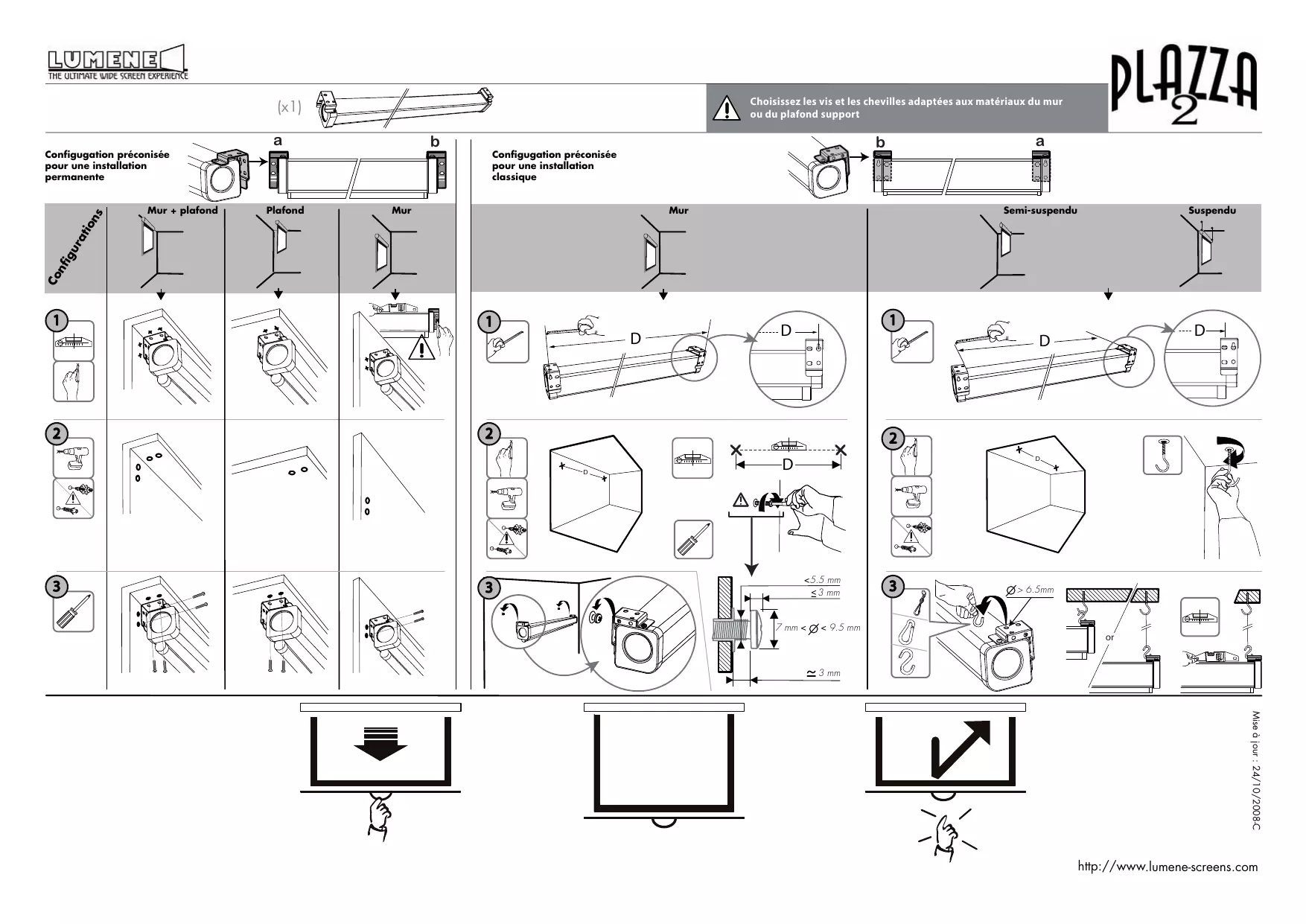 Choisissez les vis et les chevilles adaptées aux matériaux du mur ou du plafond support (x1) Mur + plafond