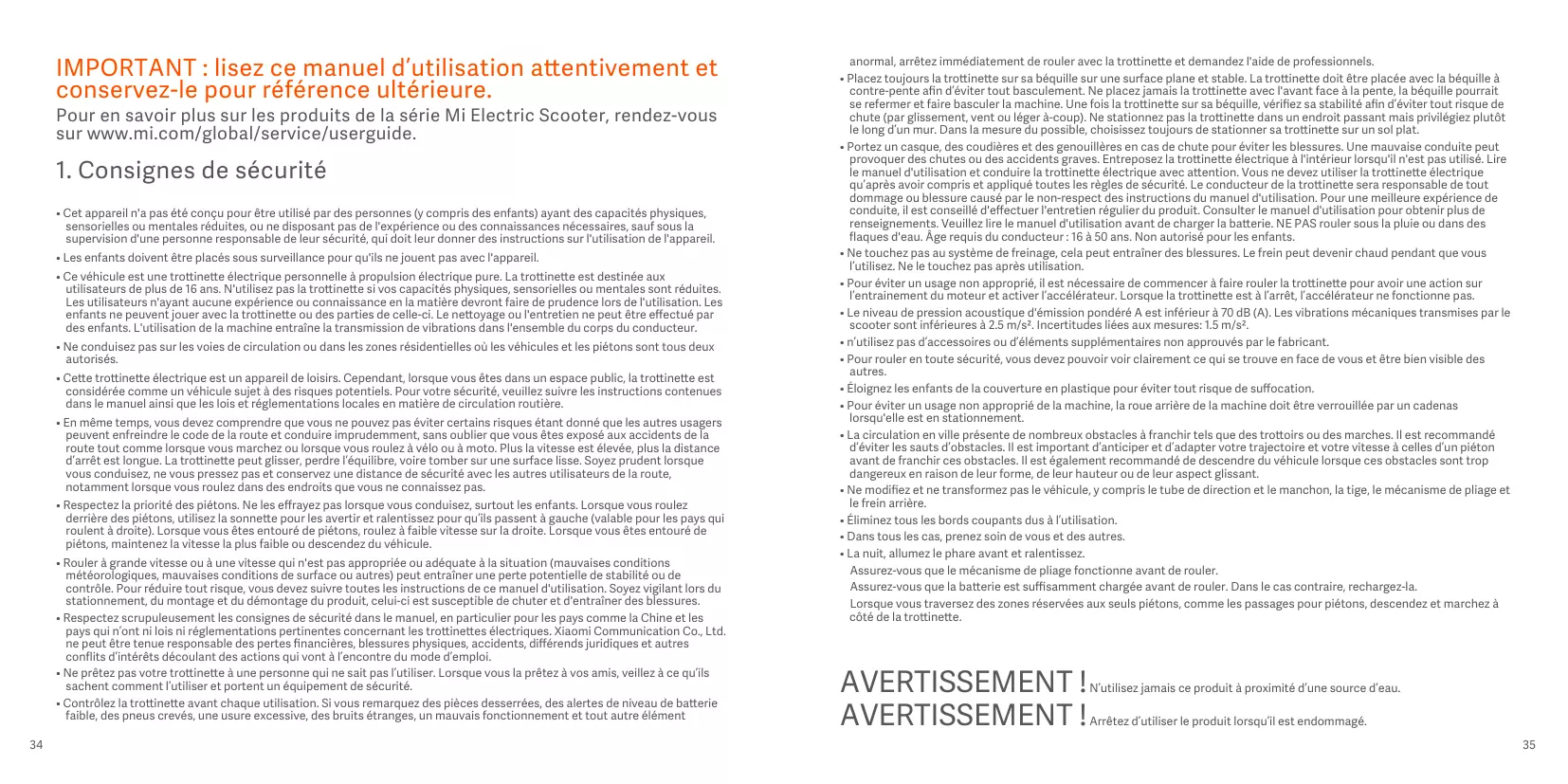 • Cet appareil n'a pas été conçu pour être utilisé par des personnes (y compris des enfants) ayant des capacités physiques, sensorielles ou mentales réduites, ou ne disposant pas de l'expérience ou des connaissances nécessaires, sauf sous la supervision d'une personne responsable de leur sécurité, qui doit leur donner des instructions sur l'utilisation de l'appareil. • Les enfants doivent être placés sous surveillance pour qu'ils ne jouent pas avec l'appareil. • Ce véhicule est une trottinette électrique personnelle à propulsion électrique pure. La trottinette est destinée aux utilisateurs de plus de 16 ans. N'utilisez pas la trottinette si vos capacités physiques, sensorielles ou mentales sont réduites. Les utilisateurs n'ayant aucune expérience ou connaissance en la matière devront faire de prudence lors de l'utilisation. Les enfants ne peuvent jouer avec la trottinette ou des parties de celle-ci. Le nettoyage ou l'entretien ne peut être effectué par des enfants. L'utilisation de la machine entraîne la transmission de vibrations dans l'ensemble du corps du conducteur. • Ne conduisez pas sur les voies de circulation ou dans les zones résidentielles où les véhicules et les piétons sont tous deux autorisés. • Cette trottinette électrique est un appareil de loisirs. Cependant, lorsque vous êtes dans un espace public, la trottinette est considérée comme un véhicule sujet à des risques potentiels. Pour votre sécurité, veuillez suivre les instructions contenues dans le manuel ainsi que les lois et réglementations locales en matière de circulation routière. • En même temps, vous devez comprendre que vous ne pouvez pas éviter certains risques étant donné que les autres usagers peuvent enfreindre le code de la route et conduire imprudemment, sans oublier que vous êtes exposé aux accidents de la route tout comme lorsque vous marchez ou lorsque vous roulez à vélo ou à moto. Plus la vitesse est élevée, plus la distance d’arrêt est longue. La trottinette peut glisser, perdre l’équilibre, voire tomber sur une surface lisse. Soyez prudent lorsque vous conduisez, ne vous pressez pas et conservez une distance de sécurité avec les autres utilisateurs de la route, notamment lorsque vous roulez dans des endroits que vous ne connaissez pas. • Respectez la priorité des piétons. Ne les effrayez pas lorsque vous conduisez, surtout les enfants. Lorsque vous roulez derrière des piétons, utilisez la sonnette pour les avertir et ralentissez pour qu’ils passent à gauche (valable pour les pays qui roulent à droite). Lorsque vous êtes entouré de piétons, roulez à faible vitesse sur la droite. Lorsque vous êtes entouré de piétons, maintenez la vitesse la plus faible ou descendez du véhicule. • Rouler à grande vitesse ou à une vitesse qui n'est pas appropriée ou adéquate à la situation (mauvaises conditions météorologiques, mauvaises conditions de surface ou autres) peut entraîner une perte potentielle de stabilité ou de contrôle. Pour réduire tout risque, vous devez suivre toutes les instructions de ce manuel d'utilisation. Soyez vigilant lors du stationnement, du montage et du démontage du produit, celui-ci est susceptible de chuter et d'entraîner des blessures. • Respectez scrupuleusement les consignes de sécurité dans le manuel, en particulier pour les pays comme la Chine et les pays qui n’ont ni lois ni réglementations pertinentes concernant les trottinettes électriques. Xiaomi Communication Co., Ltd. ne peut être tenue responsable des pertes financières, blessures physiques, accidents, différends juridiques et autres conflits d’intérêts découlant des actions qui vont à l’encontre du mode d’emploi. • Ne prêtez pas votre trottinette à une personne qui ne sait pas l’utiliser. Lorsque vous la prêtez à vos amis, veillez à ce qu’ils sachent comment l’utiliser et portent un équipement de sécurité. • Contrôlez la trottinette avant chaque utilisation. Si vous remarquez des pièces desserrées, des alertes de niveau de batterie faible, des pneus crevés, une usure excessive, des bruits étranges, un mauvais fonctionnement et tout autre élément 34