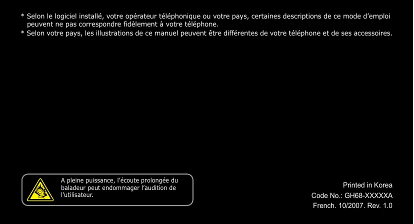 - Selon votre pays, les illustrations de ce manuel peuvent être différentes de votre téléphone et de ses accessoires. A pleine puissance, l’écoute prolongée du baladeur peut endommager l’audition de l’utilisateur. Printed in Korea Code No.: GH68-XXXXXA French. 10/2007. Rev. 1.0 SGH-P180 Mode d’emploi N’utilisez jamais votre téléphone en conduisant Garez votre véhicule avant d’utiliser un téléphone en prise directe. Consignes de sécurité importantes Avant de vous servir de votre téléphone mobile, lisez les consignes de sécurité suivantes afin d’éviter toute utilisation dangereuse ou frauduleuse de votre téléphone. Copyright