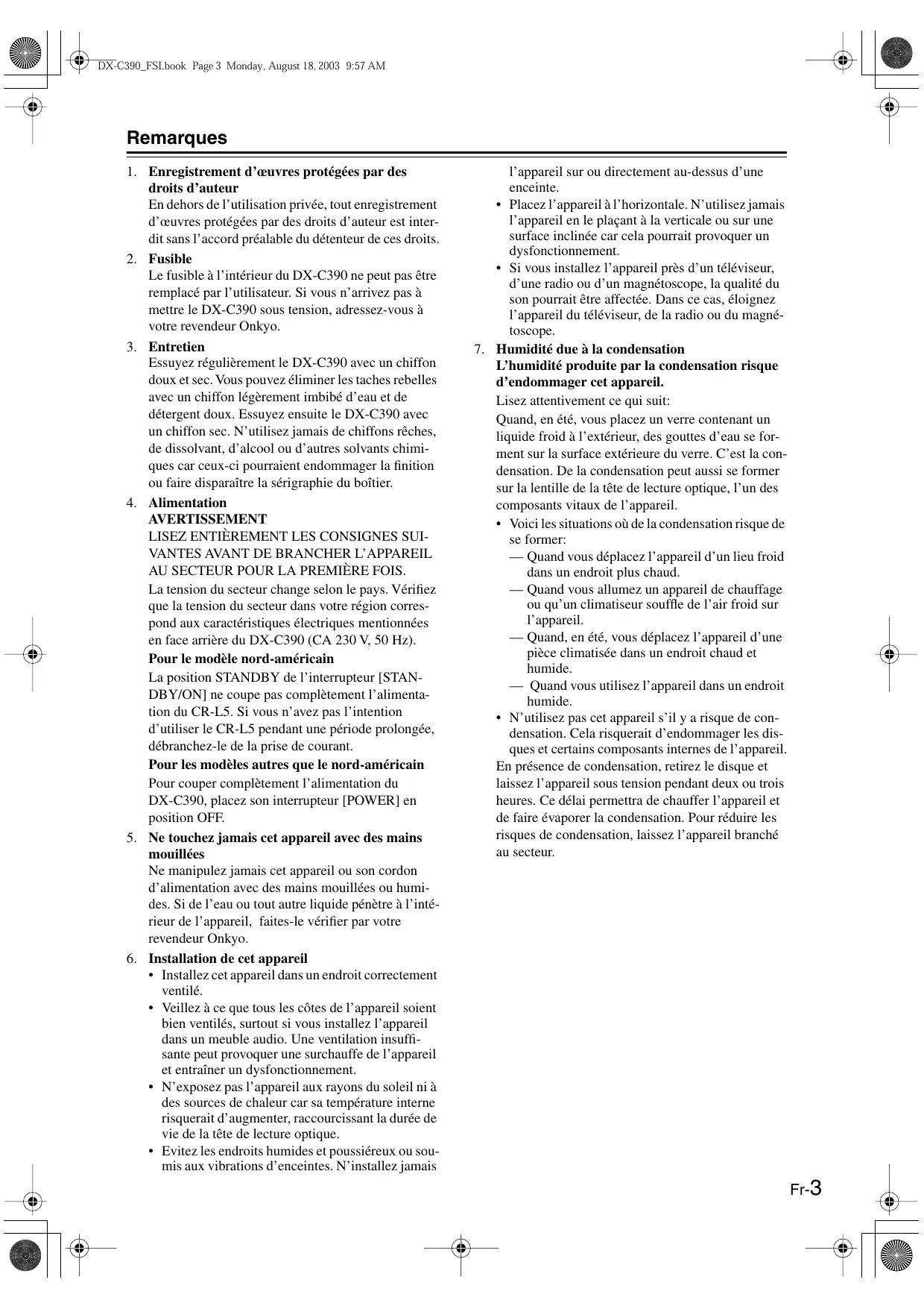 1. Enregistrement d’œuvres protégées par des droits d’auteur En dehors de l’utilisation privée, tout enregistrement d’œuvres protégées par des droits d’auteur est interdit sans l’accord préalable du détenteur de ces droits. 2. Fusible Le fusible à l’intérieur du DX-C390 ne peut pas être remplacé par l’utilisateur. Si vous n’arrivez pas à mettre le DX-C390 sous tension, adressez-vous à votre revendeur Onkyo. 3. Entretien Essuyez régulièrement le DX-C390 avec un chiffon doux et sec. Vous pouvez éliminer les taches rebelles avec un chiffon légèrement imbibé d’eau et de détergent doux. Essuyez ensuite le DX-C390 avec un chiffon sec. N’utilisez jamais de chiffons rêches, de dissolvant, d’alcool ou d’autres solvants chimiques car ceux-ci pourraient endommager la finition ou faire disparaître la sérigraphie du boîtier. 4. Alimentation AVERTISSEMENT LISEZ ENTIÈREMENT LES CONSIGNES SUIVANTES AVANT DE BRANCHER L’APPAREIL AU SECTEUR POUR LA PREMIÈRE FOIS. La tension du secteur change selon le pays. Vérifiez que la tension du secteur dans votre région correspond aux caractéristiques électriques mentionnées en face arrière du DX-C390 (CA 230 V, 50 Hz). Pour le modèle nord-américain La position STANDBY de l’interrupteur [STANDBY/ON] ne coupe pas complètement l’alimentation du CR-L5. Si vous n’avez pas l’intention d’utiliser le CR-L5 pendant une période prolongée, débranchez-le de la prise de courant. Pour les modèles autres que le nord-américain Pour couper complètement l’alimentation du DX-C390, placez son interrupteur [POWER] en position OFF. 5. Ne touchez jamais cet appareil avec des mains mouillées Ne manipulez jamais cet appareil ou son cordon d’alimentation avec des mains mouillées ou humides. Si de l’eau ou tout autre liquide pénètre à l’intérieur de l’appareil, faites-le vérifier par votre revendeur Onkyo. 6. Installation de cet appareil • Installez cet appareil dans un endroit correctement ventilé. • Veillez à ce que tous les côtes de l’appareil soient bien ventilés, surtout si vous installez l’appareil dans un meuble audio. Une ventilation insuffisante peut provoquer une surchauffe de l’appareil et entraîner un dysfonctionnement. • N’exposez pas l’appareil aux rayons du soleil ni à des sources de chaleur car sa température interne risquerait d’augmenter, raccourcissant la durée de vie de la tête de lecture optique. • Evitez les endroits humides et poussiéreux ou soumis aux vibrations d’enceintes. N’installez jamais
