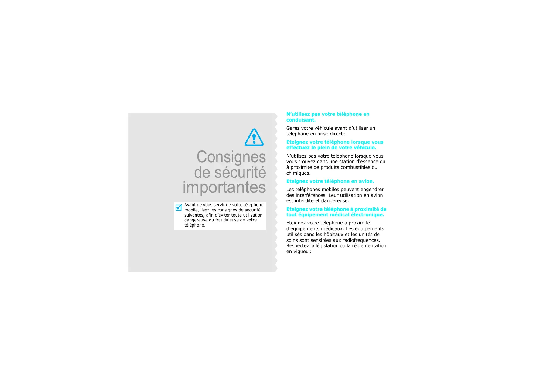 Pour les possesseurs de véhicules équipés d’airbags, n’oubliez pas que le déclenchement de ce dispositif est très violent. Ne placez pas d’objet, y compris un équipement téléphonique fixe ou mobile, au-dessus de l’airbag ni dans sa zone de déploiement. Si l’équipement téléphonique n’est pas installé correctement, le déclenchement de l’airbag pourrait occasionner des blessures graves au conducteur. Eteignez votre téléphone cellulaire en avion. L’utilisation de ce type de téléphones en avion est illégale et peut s’avérer dangereuse pour le fonctionnement de l’avion. Pour le contrevenant, le non respect de ces instructions peut aboutir à la suspension ou à l’interdiction d’abonnement à des services de téléphonie, à des poursuites, voire aux deux actions combinées.