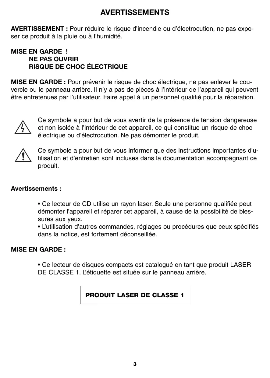 MISE EN GARDE : Pour prévenir le risque de choc électrique, ne pas enlever le couvercle ou le panneau arrière. Il n’y a pas de pièces à l’intérieur de l’appareil qui peuvent être entretenues par l’utilisateur. Faire appel à un personnel qualifié pour la réparation. Ce symbole a pour but de vous avertir de la présence de tension dangereuse et non isolée à l’intérieur de cet appareil, ce qui constitue un risque de choc électrique ou d’électrocution. Ne pas démonter le produit. Ce symbole a pour but de vous informer que des instructions importantes d’utilisation et d’entretien sont incluses dans la documentation accompagnant ce produit. Avertissements :