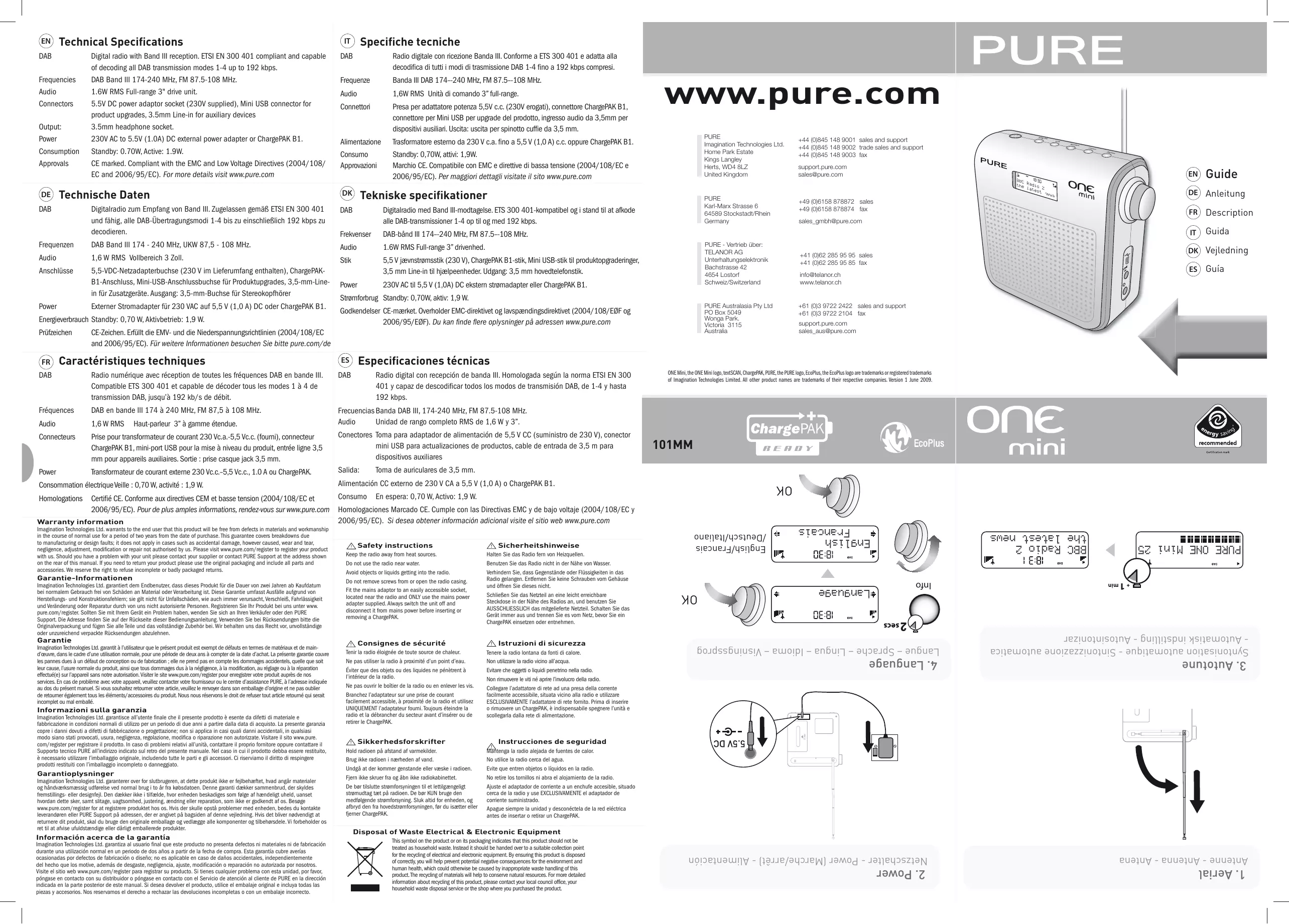 Imagination Technologies Ltd. garantit à l'utilisateur que le produit est exempt de défaut en termes de matériaux et de main-d'œuvre, dans le cadre d'une utilisation normale, pour une période de deux ans à compter de la date d'achat. La présente garantie couvre les pannes dues à un défaut de conception ou de fabrication ; elle ne prend pas en compte les dommages accidentels, quel que soit leur cause, l'usure normale du produit, ainsi que tous dommages dus à la négligence, à la modification, au réglage ou à la réparation effectuée sur l'appareil sans notre autorisation. Visiter le site www.pure.com/register pour enregistrer votre produit auprès de nos services. En cas de problème avec cet appareil, veuillez contacter votre fournisseur ou le centre d'assistance PURE, à l'adresse indiquée au dos du produit manuel. Si vous souhaitez retourner votre article, veuillez le renvoyer dans son emballage d'origine et ne pas ouvrir. Bilquer de retourner également tous les éléments/accessoires du produit. Nous nous réservons le droit de refuser tout article retourné qui serait incomplet ou mal emballé.