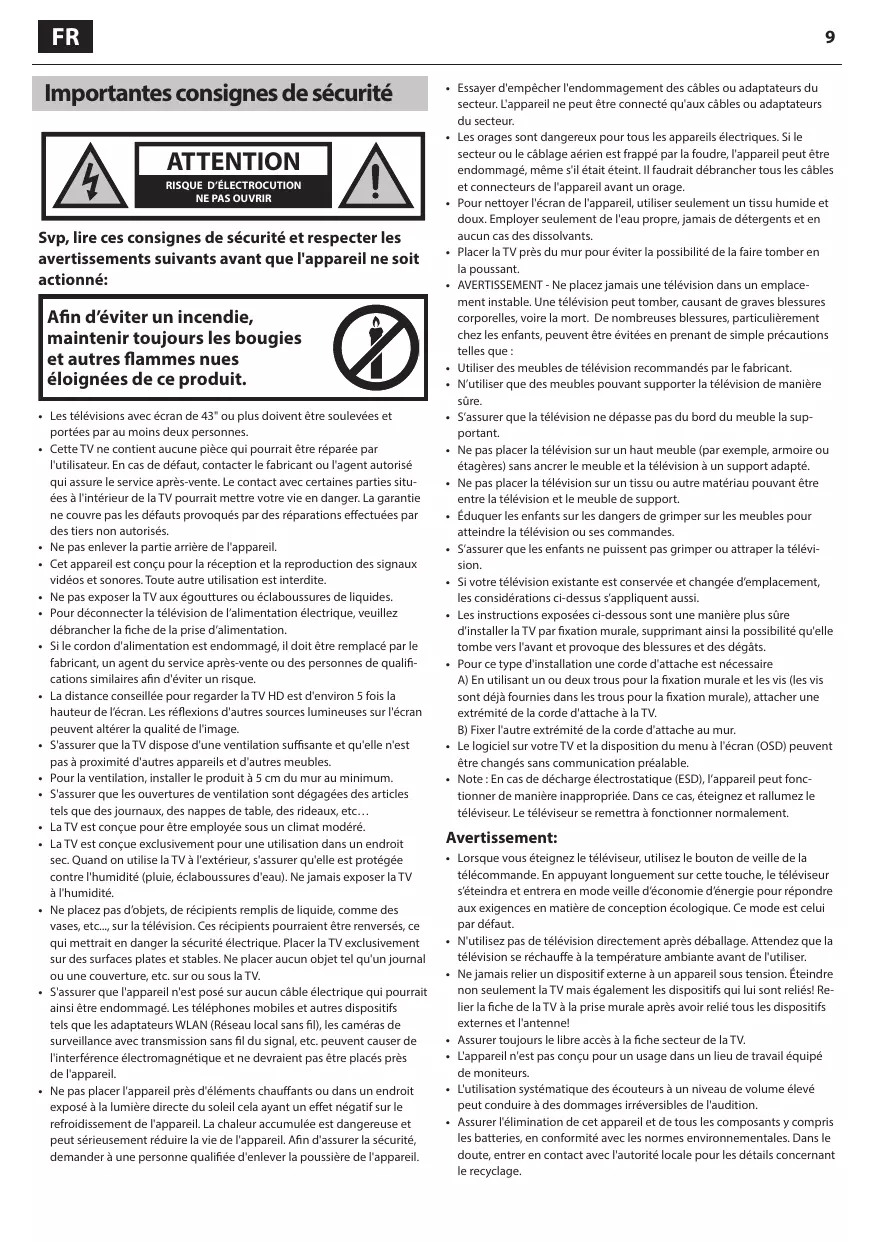 • AVERTISSEMENT - Ne placez jamais une télévision dans un emplacement instable. Une télévision peut tomber, causant de graves blessures corporelles, voire la mort. De nombreuses blessures, particulièrement chez les enfants, peuvent être évitées en prenant de simple précautions telles que :