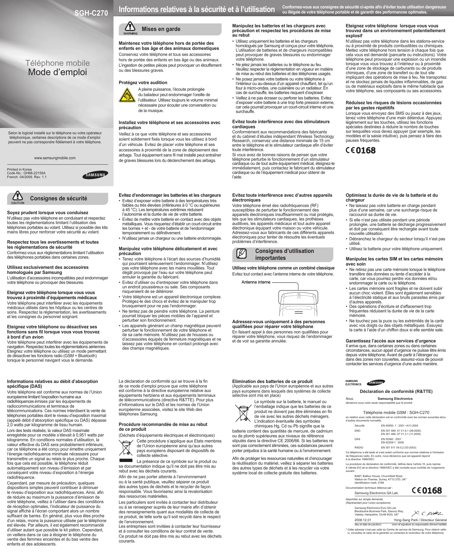 - Ne touchez pas la puce ou les extrémités de la carte avec vos doigts ou des objets métalliques. Essuyez la carte à l’aide d’un chiffon doux si elle semble sale. Garantissez l’accès aux services d’urgence Il arrive que, dans certaines zones ou dans certaines circonstances, aucun appel d’urgence ne puisse être émis depuis votre téléphone. Avant de partir à l’étranger ou dans des zones non couvertes, assurez-vous de pouvoir contacter les services d’urgence d’une autre manière. Elimination des batteries de ce produit (Applicable aux pays de l’Union européenne et aux autres pays européens dans lesquels des systèmes de collecte sélective sont mis en place) Le symbole sur la batterie, le manuel ou l’emballage indique que les batteries de ce produit ne doivent pas être éliminées en fin de vie avec les autres déchets ménagers. L’indication éventuelle des symboles chimiques Hg, Cd ou Pb signifie que la batterie contient des quantités de mercure, de cadmium ou de plomb supérieures aux niveaux de référence stipulés dans la directive CE 2006/66. Si les batteries ne sont pas correctement éliminées, ces substances peuvent porter préjudice à la santé humaine ou à l’environnement. Afin de protéger les ressources naturelles et d’encourager la réutilisation du matériel, veillez à séparer les batteries des autres types de déchets et à les recycler via votre système local de collecte gratuite des batteries. Déclaration de conformité (R&TTE) Samsung Electronics Nous, déclarons sous notre seule responsabilité que le produit Téléphone mobile GSM : SGH-C270 en relation avec cette déclaration est en conformité avec les normes suivantes et/ou d’autres documents normatifs. Sécurité EN 60950- 1 : 2001 +A11:2004 EMC EN 301 489- 01 V1.6.1 (09-2005) EN 301 489- 07 V1.3.1 (11-2005) DAS EN 50360 : 2001 EN 62209-1 : 2006 RADIO EN 301 511 V9.0.2 (03-2003) Ce téléphone a été testé et s’est avéré conforme aux normes relatives à l’émission de fréquences radio. En outre, nous déclarons que cet appareil répond à la directive 1999/5/EC. La procédure de déclaration de conformité, définie dans l’article 10, puis reprise à l’alinéa [IV] de la directive 1999/5/EC a été conduite sous contrôle de l’organisme suivant : BABT, Balfour House, Churchfield Road, Walton-on-Thames, Surrey, KT12 2TD, UK* Identification mark: 0168 Documentation technique détenue par : Samsung Electronics QA Lab. disponible sur simple demande. (Représentant pour l’union européenne) Samsung Electronics Euro QA Lab. Blackbushe Business Park, Saxony Way, Yateley, Hampshire, GU46 6GG, UK*