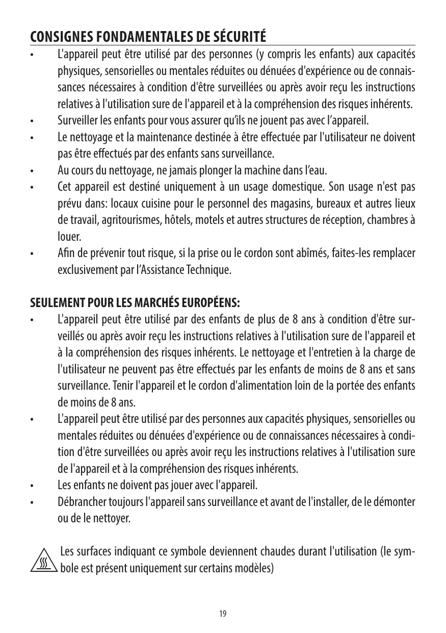 L'appareil peut être utilisé par des personnes (y compris les enfants) aux capacités physiques, sensorielles ou mentales réduites ou dénuées d'expérience ou de connaissances nécessaires à condition d'être surveillées ou après avoir reçu les instructions relatives à l'utilisation sure de l'appareil et à la compréhension des risques inhérents. Surveiller les enfants pour vous assurer qu’ils ne jouent pas avec l’appareil. Le nettoyage et la maintenance destinée à être effectuée par l'utilisateur ne doivent pas être effectués par des enfants sans surveillance. Au cours du nettoyage, ne jamais plonger la machine dans l’eau. Cet appareil est destiné uniquement à un usage domestique. Son usage n'est pas prévu dans: locaux cuisine pour le personnel des magasins, bureaux et autres lieux de travail, agritourismes, hôtels, motels et autres structures de réception, chambres à louer. Afin de prévenir tout risque, si la prise ou le cordon sont abîmés, faites-les remplacer exclusivement par l’Assistance Technique. SEULEMENT POUR LES MARCHÉS EUROPÉENS: L'appareil peut être utilisé par des enfants de plus de 8 ans à condition d'être surveillés ou après avoir reçu les instructions relatives à l'utilisation sure de l'appareil et à la compréhension des risques inhérents. Le nettoyage et l'entretien à la charge de l'utilisateur ne peuvent pas être effectués par les enfants de moins de 8 ans et sans surveillance. Tenir l'appareil et le cordon d'alimentation loin de la portée des enfants de moins de 8 ans. L'appareil peut être utilisé par des personnes aux capacités physiques, sensorielles ou mentales réduites ou dénuées d'expérience ou de connaissances nécessaires à condition d'être surveillées ou après avoir reçu les instructions relatives à l'utilisation sure de l'appareil et à la compréhension des risques inhérents. Les enfants ne doivent pas jouer avec l'appareil. Débrancher toujours l'appareil sans surveillance et avant de l'installer, de le démonter ou de le nettoyer. Les surfaces indiquant ce symbole deviennent chaudes durant l'utilisation (le symbole est présent uniquement sur certains modèles)