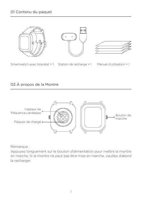 Amazfit GTS 2 mini Manuel du produit A2018 01 Contenu du paquet Smartwatch avec bracelet × 1 Station de recharge × 1 Manuel d'utilisation × 1 02 À propos de la Montre Capteur de fréquence cardiaque Bouton de marche Plaques de charge Remarque : Appuyez longuement sur le bouton d'alimentation pour mettre la montre en marche. Si la montre ne peut pas être mise en marche, veuillez d'abord la recharger.