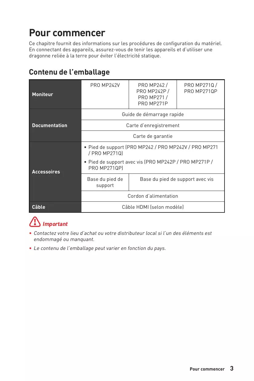 Guide de démarrage rapide Carte d’enregistrement Carte de garantie ∙∙ Pied de support (PRO MP242 / PRO MP242V / PRO MP271 / PRO MP271Q) Accessoires Câble ⚠⚠Important ∙∙ Pied de support avec vis (PRO MP242P / PRO MP271P / PRO MP271QP) Base du pied de support Base du pied de support avec vis Cordon d’alimentation Câble HDMI (selon modèle) ∙∙ Contactez votre lieu d’achat ou votre distributeur local si l’un des éléments est endommagé ou manquant. ∙∙ Le contenu de l’emballage peut varier en fonction du pays. Pour commencer
