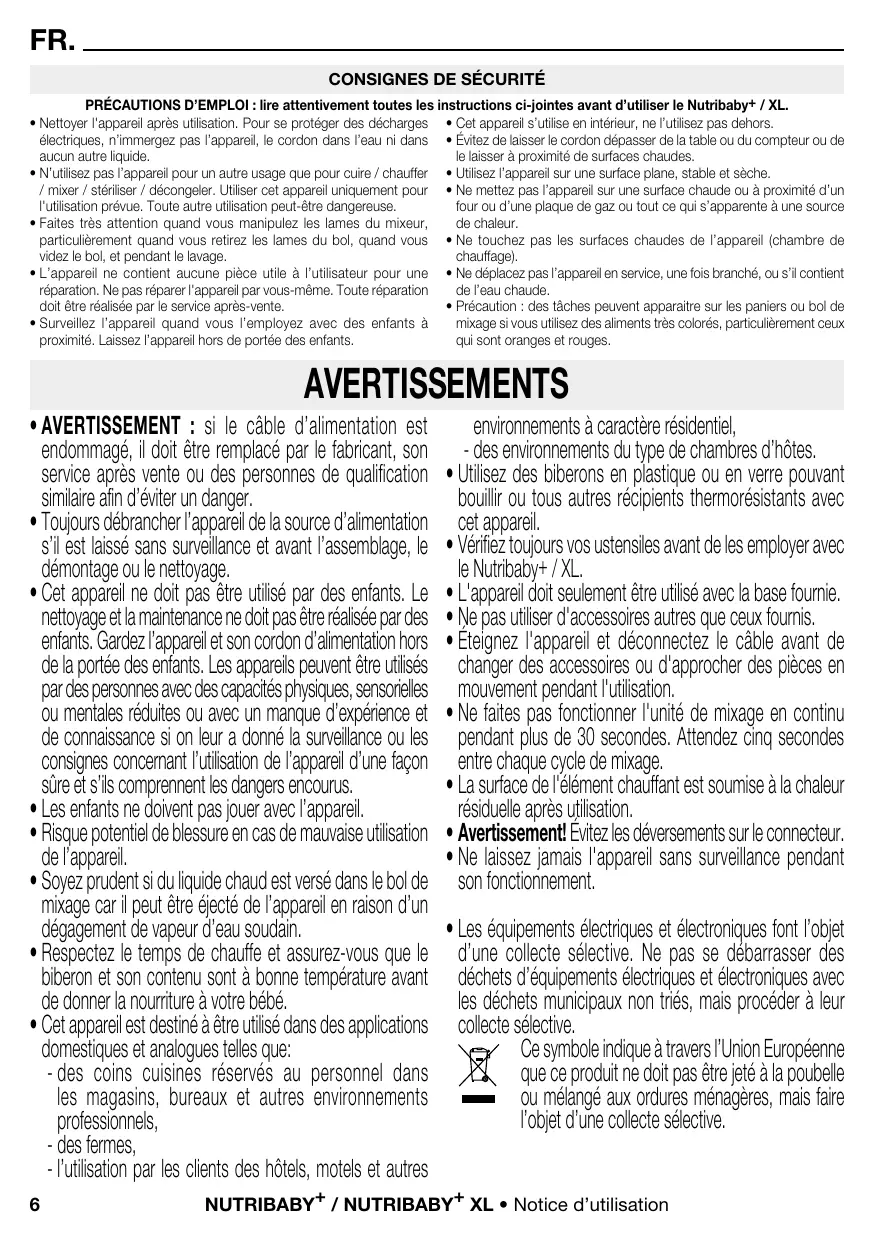 - d es environnements du type de chambres d’hôtes. • Utilisez des biberons en plastique ou en verre pouvant bouillir ou tous autres récipients thermorésistants avec cet appareil. • Vérifiez toujours vos ustensiles avant de les employer avec le Nutribaby+ / XL. • L 'appareil doit seulement être utilisé avec la base fournie. • N e pas utiliser d'accessoires autres que ceux fournis. • Éteignez l'appareil et déconnectez le câble avant de changer des accessoires ou d'approcher des pièces en mouvement pendant l'utilisation. • Ne faites pas fonctionner l'unité de mixage en continu pendant plus de 30 secondes. Attendez cinq secondes entre chaque cycle de mixage. • La surface de l'élément chauffant est soumise à la chaleur résiduelle après utilisation. • A vertissement! Évitez les déversements sur le connecteur. • Ne laissez jamais l'appareil sans surveillance pendant son fonctionnement. • Les équipements électriques et électroniques font l’objet d’une collecte sélective. Ne pas se débarrasser des déchets d’équipements électriques et électroniques avec les déchets municipaux non triés, mais procéder à leur collecte sélective. Ce symbole indique à travers l’Union Européenne que ce produit ne doit pas être jeté à la poubelle ou mélangé aux ordures ménagères, mais faire l’objet d’une collecte sélective.