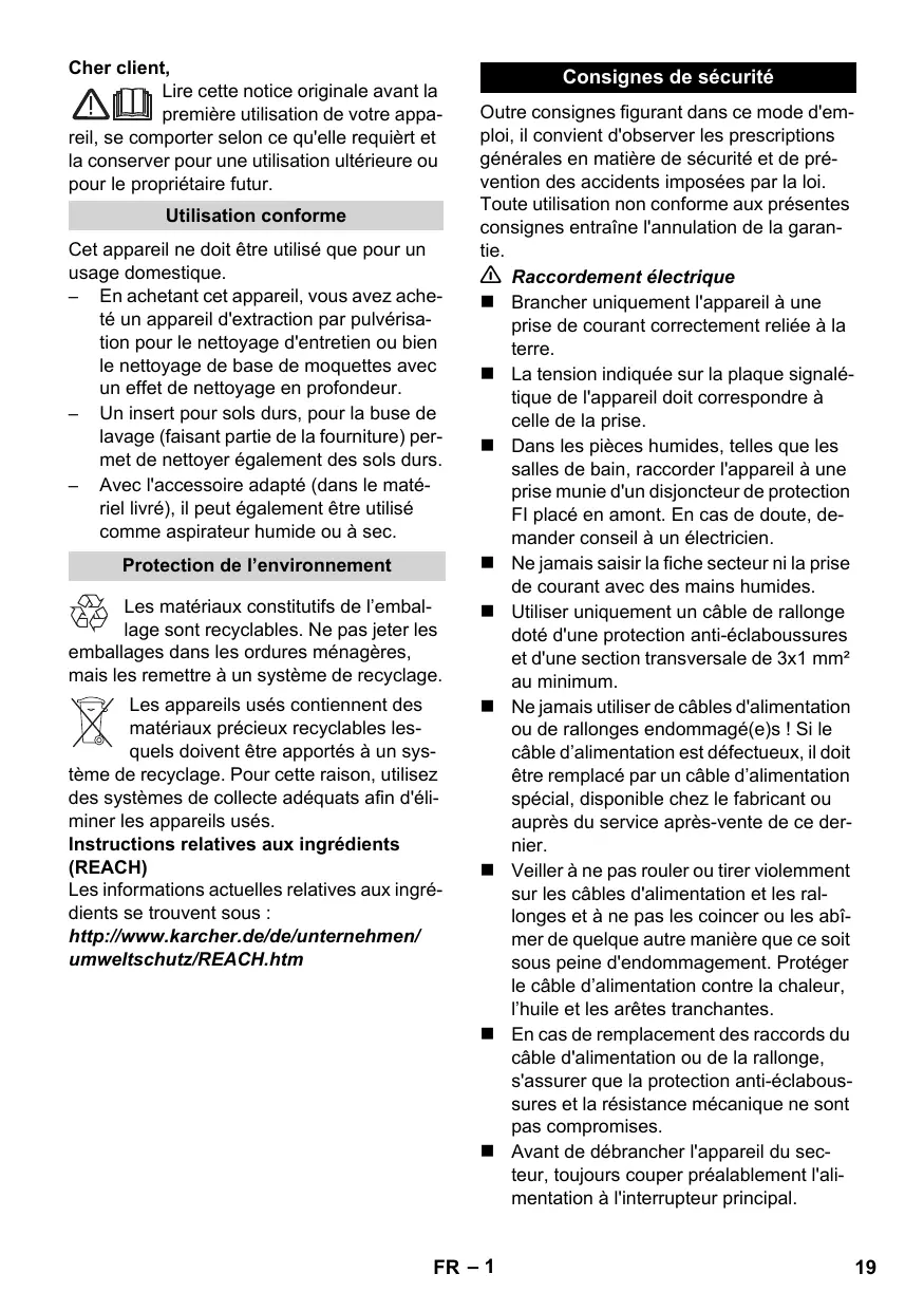 Cher client, Lire cette notice originale avant la première utilisation de votre appareil, se comporter selon ce qu'elle requièrt et la conserver pour une utilisation ultérieure ou pour le propriétaire futur. Utilisation conforme Cet appareil ne doit être utilisé que pour un usage domestique. – En achetant cet appareil, vous avez acheté un appareil d'extraction par pulvérisation pour le nettoyage d'entretien ou bien le nettoyage de base de moquettes avec un effet de nettoyage en profondeur. – Un insert pour sols durs, pour la buse de lavage (faisant partie de la fourniture) permet de nettoyer également des sols durs. – Avec l'accessoire adapté (dans le matériel livré), il peut également être utilisé comme aspirateur humide ou à sec. Protection de l’environnement Les matériaux constitutifs de l’emballage sont recyclables. Ne pas jeter les emballages dans les ordures ménagères, mais les remettre à un système de recyclage. Les appareils usés contiennent des matériaux précieux recyclables lesquels doivent être apportés à un système de recyclage. Pour cette raison, utilisez des systèmes de collecte adéquats afin d'éliminer les appareils usés. Instructions relatives aux ingrédients (REACH) Les informations actuelles relatives aux ingrédients se trouvent sous : http://www.karcher.de/de/unternehmen/ umweltschutz/REACH.htm Consignes de sécurité Outre consignes figurant dans ce mode d'emploi, il convient d'observer les prescriptions générales en matière de sécurité et de prévention des accidents imposées par la loi. Toute utilisation non conforme aux présentes consignes entraîne l'annulation de la garantie. 몇 Raccordement électrique Brancher uniquement l'appareil à une prise de courant correctement reliée à la terre. La tension indiquée sur la plaque signalétique de l'appareil doit correspondre à celle de la prise. Dans les pièces humides, telles que les salles de bain, raccorder l'appareil à une prise munie d'un disjoncteur de protection FI placé en amont. En cas de doute, demander conseil à un électricien. Ne jamais saisir la fiche secteur ni la prise de courant avec des mains humides. Utiliser uniquement un câble de rallonge doté d'une protection anti-éclaboussures et d'une section transversale de 3x1 mm² au minimum. Ne jamais utiliser de câbles d'alimentation ou de rallonges endommagé(e)s ! Si le câble d’alimentation est défectueux, il doit être remplacé par un câble d’alimentation spécial, disponible chez le fabricant ou auprès du service après-vente de ce dernier. Veiller à ne pas rouler ou tirer violemment sur les câbles d'alimentation et les rallonges et à ne pas les coincer ou les abîmer de quelque autre manière que ce soit sous peine d'endommagement. Protéger le câble d’alimentation contre la chaleur, l’huile et les arêtes tranchantes. En cas de remplacement des raccords du câble d'alimentation ou de la rallonge, s'assurer que la protection anti-éclaboussures et la résistance mécanique ne sont pas compromises. Avant de débrancher l'appareil du secteur, toujours couper préalablement l'alimentation à l'interrupteur principal. FR – 1