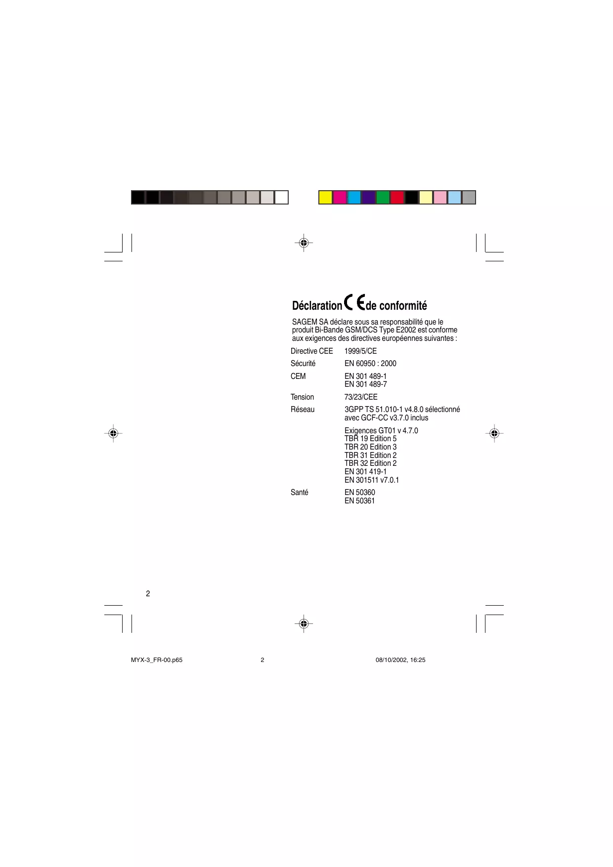 SAGEM SA déclare sous sa responsabilité que le produit Bi-Bande GSM/DCS Type E2002 est conforme aux exigences des directives européennes suivantes : Directive CEE