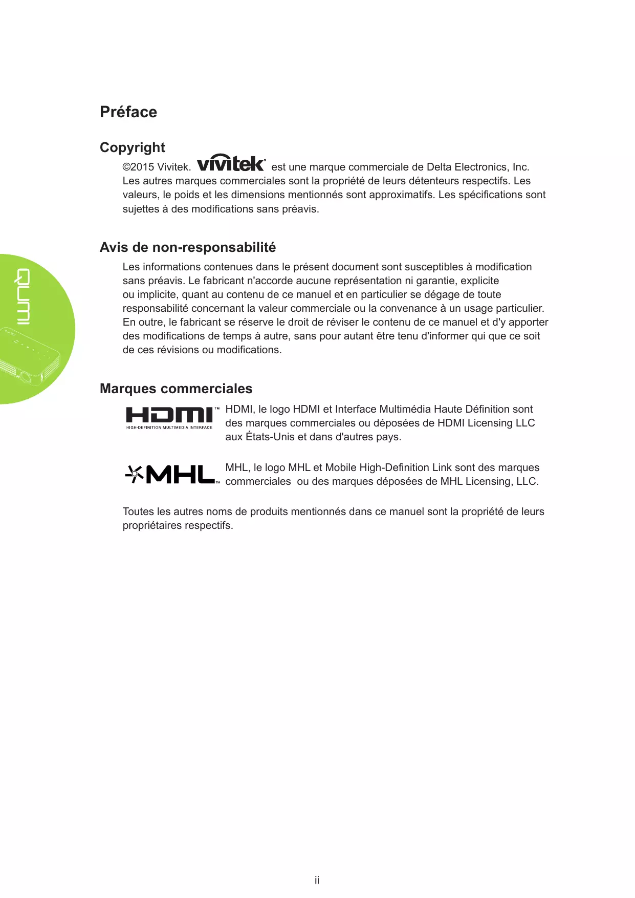 ©2015 Vivitek. vivitek® est une marque commerciale de Delta Electronics, Inc. Les autres marques commerciales sont la propriété de leurs détenteurs respectifs. Les valeurs, le poids et les dimensions mentionnés sont approximatifs. Les specifications sont sujettes à des modifications sans préavis.
