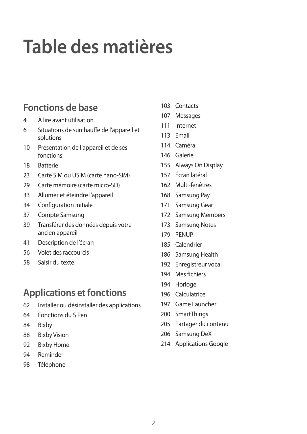 À lire avant utilisation Situations de surchauffe de l’appareil et solutions Présentation de l’appareil et de ses fonctions Batterie Carte SIM ou USIM (carte nano-SIM) Carte mémoire (carte micro-SD) Allumer et éteindre l’appareil Configuration initiale Compte Samsung Transférer des données depuis votre ancien appareil Description de l’écran Volet des raccourcis Saisir du texte Applications et fonctions