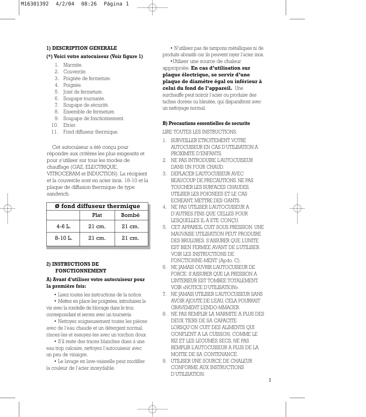 • N’utilisez pas de tampons métalliques ni de produits abrasifs car ils peuvent rayer l’acier inox. •Utiliser une source de chaleur appropriée. En cas d’utilisation sur plaque électrique, se servir d’une plaque de diamètre égal ou inférieur à celui du fond de l’appareil. Une surchauffe peut noircir l’acier ou produire des taches dorées ou bleutée, qui disparaîtront avec un nettoyage normal. B) Precautions essentielles de securite LIRE TOUTES LES INSTRUCTIONS. 1. SURVEILLER ETROITEMENT VOTRE AUTOCUISEUR EN CAS D’UTILISATION A PROXIMITE D’ENFANTS. 2. NE PAS INTRODUIRE L’AUTOCUISEUR DANS UN FOUR CHAUD. 3. DEPLACER L’AUTOCUISEUR AVEC BEAUCOUP DE PRECAUTIONS. NE PAS TOUCHER LES SURFACES CHAUDES. UTILISER LES POIGNEES ET LE CAS ECHEANT, METTRE DES GANTS. 4. NE PAS UTILISER L’AUTOCUISEUR A D’AUTRES FINS QUE CELLES POUR LESQUELLES IL A ETE CONÇU. 5. CET APPAREIL CUIT SOUS PRESSION. UNE MAUVAISE UTILISATION PEUT PRODUIRE DES BRULURES. S’ASSURER QUE L’UNITE EST BIEN FERMEE AVANT DE L’UTILISER. VOIR LES INSTRUCTIONS DE FONCTIONNE-MENT (Apdo. C). 6. NE JAMAIS OUVRIR L’AUTOCUISEUR DE FORCE. S’ASSURER QUE LA PRESSION A L’INTERIEUR EST TOMBEE TOTALEMENT. VOIR «NOTICE D’UTILISATION». 7. NE JAMAIS UTILISER L’AUTOCUISEUR SANS AVOIR AJOUTE DE L’EAU, CELA POURRAIT GRAVEMENT L’ENDO-MMAGER. 8. NE PAS REMPLIR LA MARMITE A PLUS DES DEUX TIERS DE SA CAPACITE. LORSQU’ON CUIT DES ALIMENTS QUI GONFLENT A LA CUISSON, COMME LE RIZ ET LES LEGUMES SECS, NE PAS REMPLIR L’AUTOCUISEUR A PLUS DE LA MOITIE DE SA CONTENANCE. 9. UTILISER UNE SOURCE DE CHALEUR CONFORME AUX INSTRUCTIONS D’UTILISATION. 1