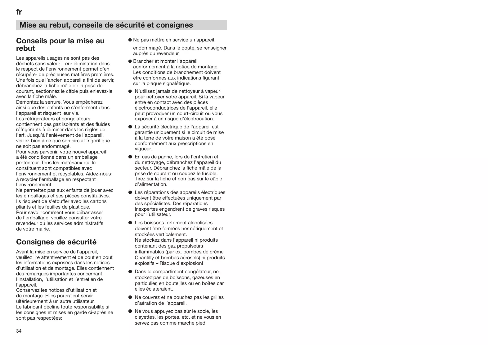 fr Mise au rebut, conseils de sécurité et consignes Conseils pour la mise au rebut Les appareils usagés ne sont pas des déchets sans valeur. Leur élimination dans le respect de l’environnement permet d’en récupérer de précieuses matières premières. Une fois que l’ancien appareil a fini de servir, débranchez la fiche mâle de la prise de courant, sectionnez le câble puis enlevez-le avec la fiche mâle. Démontez la serrure. Vous empêcherez ainsi que des enfants ne s’enferment dans l’appareil et risquent leur vie. Les réfrigérateurs et congélateurs contiennent des gaz isolants et des fluides réfrigérants à éliminer dans les règles de l’art. Jusqu’à l’enlèvement de l’appareil, veillez bien à ce que son circuit frigorifique ne soit pas endommagé. Pour vous parvenir, votre nouvel appareil a été conditionné dans un emballage protecteur. Tous les matériaux qui le constituent sont compatibles avec l’environnement et recyclables. Aidez-nous à recycler l’emballage en respectant l’environnement. Ne permettez pas aux enfants de jouer avec les emballages et ses pièces constitutives. Ils risquent de s’étouffer avec les cartons pliants et les feuilles de plastique. Pour savoir comment vous débarrasser de l’emballage, veuillez consulter votre revendeur ou les services administratifs de votre mairie.