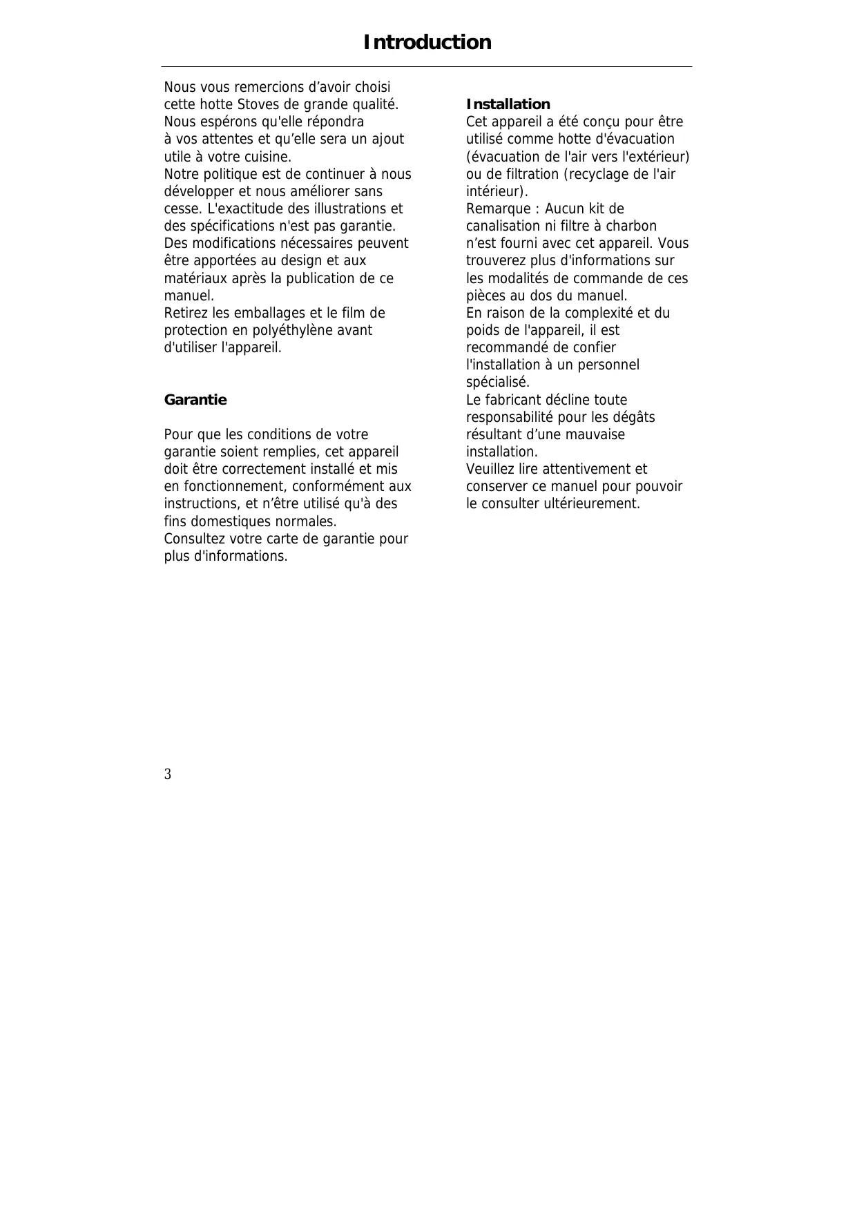 Introduction Nous vous remercions d’avoir choisi cette hotte Stoves de grande qualité. Nous espérons qu'elle répondra à vos attentes et qu’elle sera un ajout utile à votre cuisine. Notre politique est de continuer à nous développer et nous améliorer sans cesse. L'exactitude des illustrations et des spécifications n'est pas garantie. Des modifications nécessaires peuvent être apportées au design et aux matériaux après la publication de ce manuel. Retirez les emballages et le film de protection en polyéthylène avant d'utiliser l'appareil. Garantie Pour que les conditions de votre garantie soient remplies, cet appareil doit être correctement installé et mis en fonctionnement, conformément aux instructions, et n’être utilisé qu'à des fins domestiques normales. Consultez votre carte de garantie pour plus d'informations.