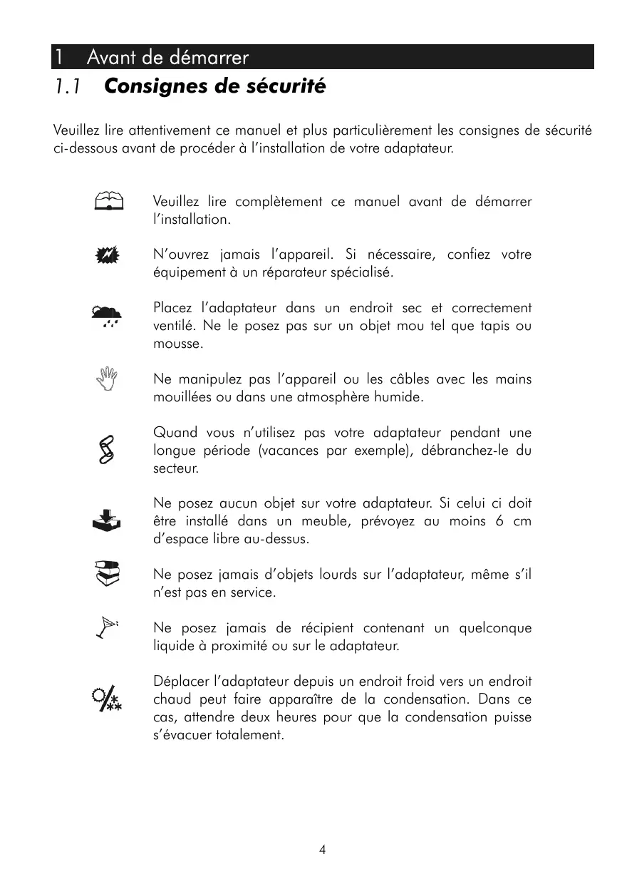 d sécurité Veuillez lirre attentivement ce e manuel et plus p particulièrement less consignes de séccurité ci-dessouss avant de procéde er à l’installation dee votre adaptateur. Veuillez lire e complètement cee manuel avant de démarrer l’installation N’ouvrez ja amais l’appareil. Si nécessaire, confiez votre équipement à un réparateur sp pécialisé. Placez l’ada aptateur dans un n endroit sec et correctement ventilé. Ne le posez pas sur un objet mou tel que tapis ou mousse. Ne manipulez pas l’appareil ou les câbles ave ec les mains mouillées ou u dans une atmosp phère humide. us n’utilisez pas vvotre adaptateur pendant une Quand vou longue période (vacances pa ar exemple), débra anchez-le du secteur. objet sur vo otre adaptateur. Si celui ci doit Ne posez aucun être installé é dans un meuble, prévoyez au moins 6 cm d’espace lib bre au-dessus. amais d’objets lourds sur l’adaptateu ur, même s’il Ne posez ja n’est pas en service. Ne posez jamais de récipieent contenant un quelconque liquide à pro oximité ou sur le ad daptateur. adaptateur depuis un endroit froid ve ers un endroit Déplacer l’a chaud peutt faire apparaître de la condensatio on. Dans ce cas, attendrre deux heures pour que la condenssation puisse s’évacuer to otalement.