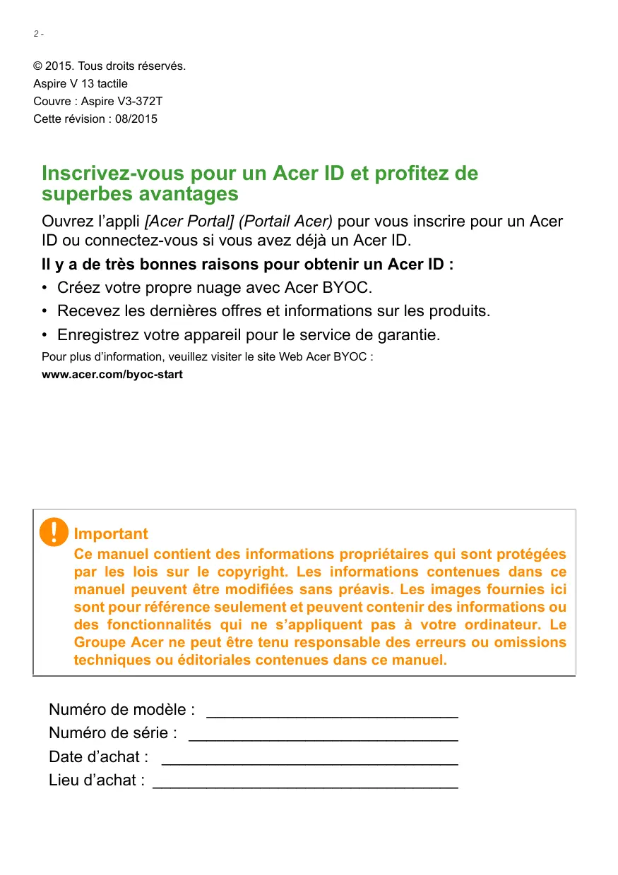 © 2015. Tous droits réservés. Aspire V 13 tactile Couvre : Aspire V3-372T Cette révision : 08/2015 Inscrivez-vous pour un Acer ID et profitez de superbes avantages Ouvrez l’appli [Acer Portal] (Portail Acer) pour vous inscrire pour un Acer ID ou connectez-vous si vous avez déjà un Acer ID. Il y a de très bonnes raisons pour obtenir un Acer ID :
