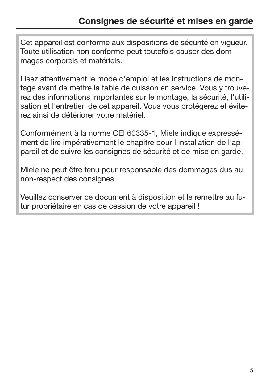 Consignes de sécurité et mises en garde Cet appareil est conforme aux dispositions de sécurité en vigueur. Toute utilisation non conforme peut toutefois causer des dommages corporels et matériels. Lisez attentivement le mode d’emploi et les instructions de montage avant de mettre la table de cuisson en service. Vous y trouverez des informations importantes sur le montage, la sécurité, l'utilisation et l'entretien de cet appareil. Vous vous protégerez et éviterez ainsi de détériorer votre matériel. Conformément à la norme CEI 60335-1, Miele indique expressément de lire impérativement le chapitre pour l'installation de l'appareil et de suivre les consignes de sécurité et de mise en garde. Miele ne peut être tenu pour responsable des dommages dus au non-respect des consignes. Veuillez conserver ce document à disposition et le remettre au futur propriétaire en cas de cession de votre appareil !