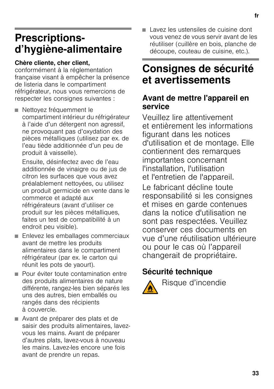 Prescriptionsd’hygiène-alimentaire Chère cliente, cher client, conformément à la réglementation française visant à empêcher la présence de listeria dans le compartiment réfrigérateur, nous vous remercions de respecter les consignes suivantes : ■