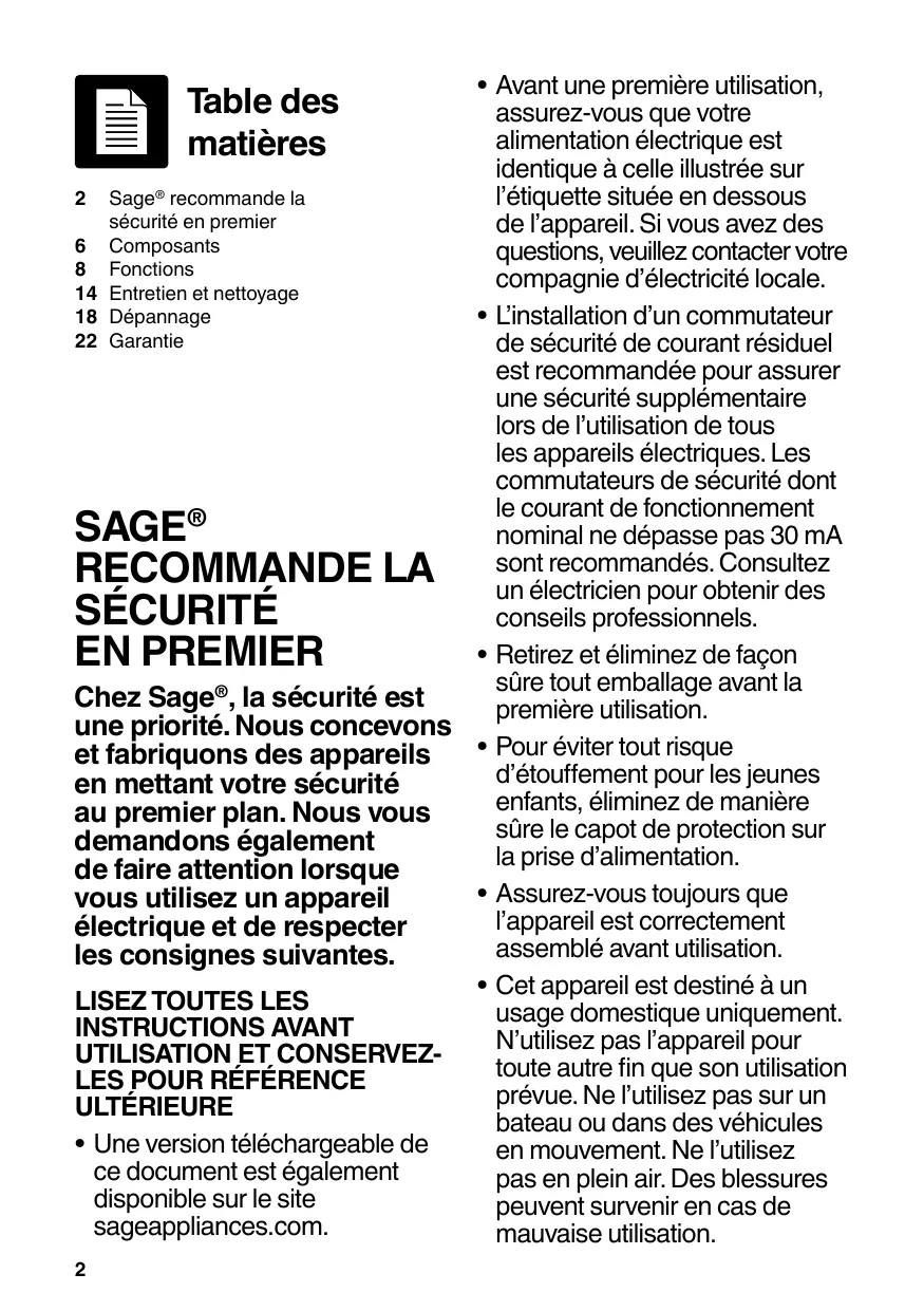 - Avant une première utilisation, assurez-vous que votre alimentation électrique est identique à celle illustrée sur l’étiquette située en dessous 2 Sage® recommande la sécurité en premier de l’appareil. Si vous avez des 6 Composants questions, veuillez contacter votre 8 Fonctions compagnie d’électricité locale. 14 Entretien et nettoyage 18 Dépannage