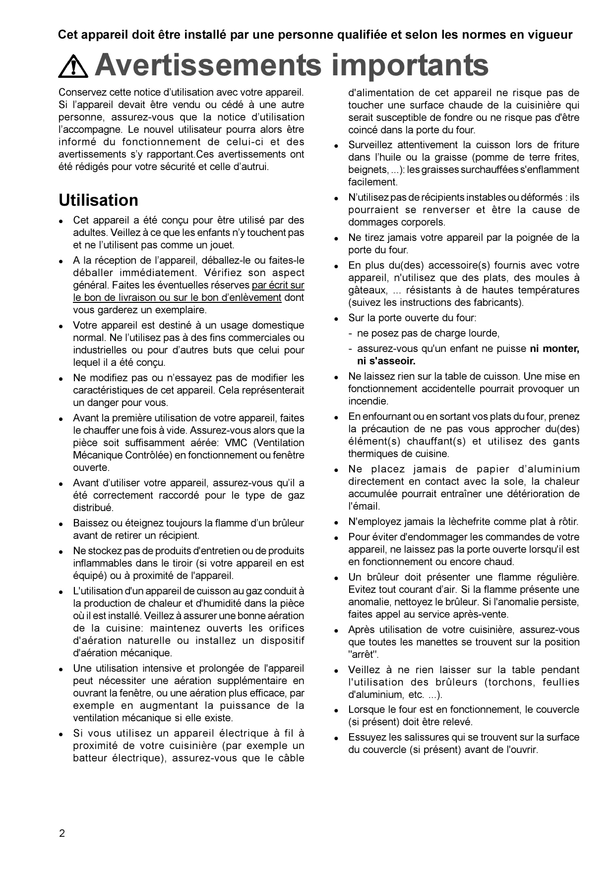 Cet appareil a été conçu pour être utilisé par des adultes. Veillez à ce que les enfants n’y touchent pas et ne l’utilisent pas comme un jouet. A la réception de l’appareil, déballez-le ou faites-le déballer immédiatement. Vérifiez son aspect général. Faites les éventuelles réserves par écrit sur le bon de livraison ou sur le bon d’enlèvement dont vous garderez un exemplaire. Votre appareil est destiné à un usage domestique normal. Ne l’utilisez pas à des fins commerciales ou industrielles ou pour d’autres buts que celui pour lequel il a été conçu. Ne modifiez pas ou n’essayez pas de modifier les caractéristiques de cet appareil. Cela représenterait un danger pour vous. Avant la première utilisation de votre appareil, faites le chauffer une fois à vide. Assurez-vous alors que la pièce soit suffisamment aérée: VMC (Ventilation Mécanique Contrôlée) en fonctionnement ou fenêtre ouverte. Avant d’utiliser votre appareil, assurez-vous qu’il a été correctement raccordé pour le type de gaz distribué. Baissez ou éteignez toujours la flamme d’un brûleur avant de retirer un récipient. Ne stockez pas de produits d'entretien ou de produits inflammables dans le tiroir (si votre appareil en est équipé) ou à proximité de l'appareil. L'utilisation d'un appareil de cuisson au gaz conduit à la production de chaleur et d'humidité dans la pièce où il est installé. Veillez à assurer une bonne aération de la cuisine: maintenez ouverts les orifices d'aération naturelle ou installez un dispositif d'aération mécanique. Une utilisation intensive et prolongée de l'appareil peut nécessiter une aération supplémentaire en ouvrant la fenêtre, ou une aération plus efficace, par exemple en augmentant la puissance de la ventilation mécanique si elle existe. Si vous utilisez un appareil électrique à fil à proximité de votre cuisinière (par exemple un batteur électrique), assurez-vous que le câble