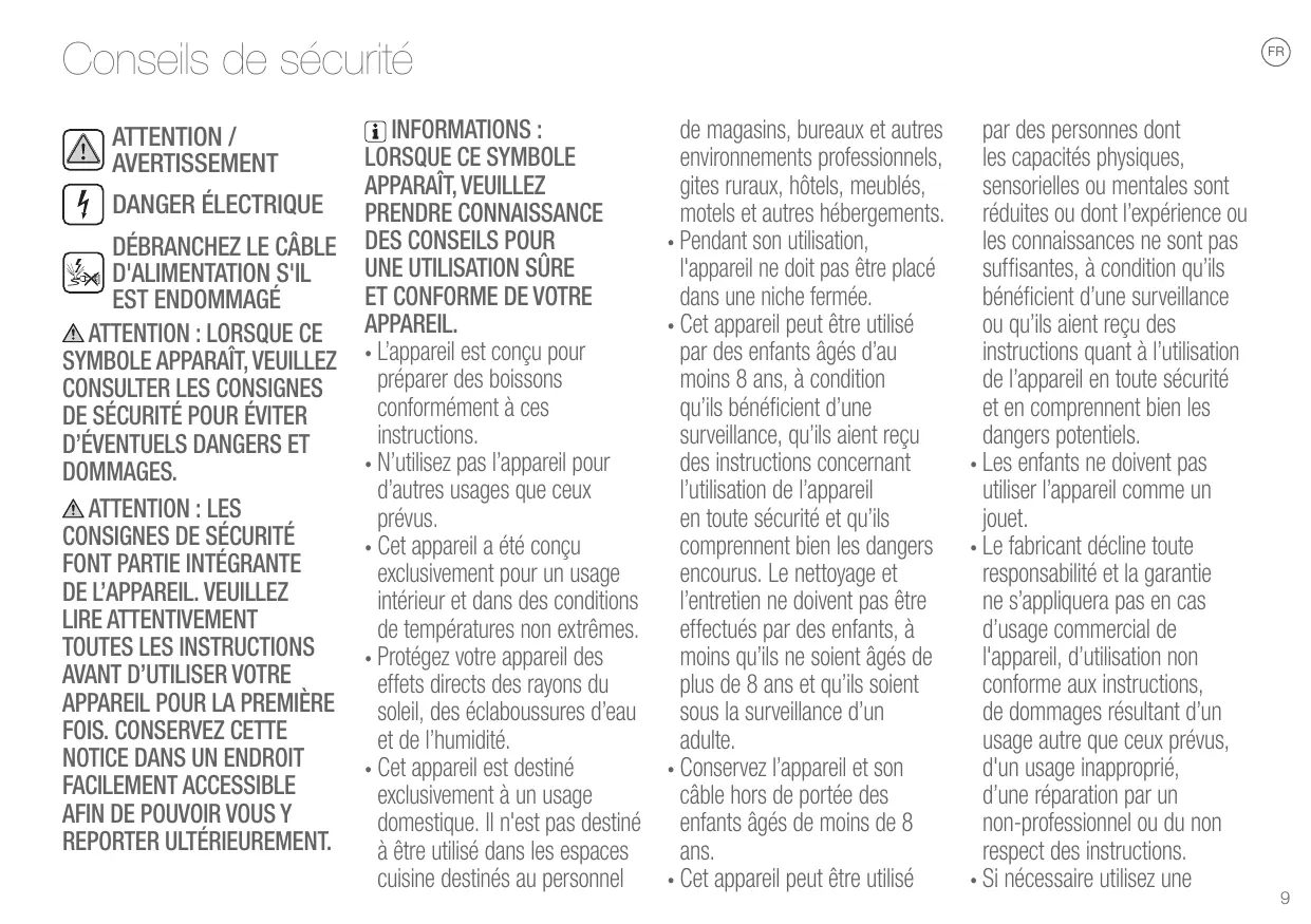 INFORMATIONS : LORSQUE CE SYMBOLE APPARAÎT, VEUILLEZ PRENDRE CONNAISSANCE DES CONSEILS POUR UNE UTILISATION SÛRE ET CONFORME DE VOTRE APPAREIL. • L’appareil est conçu pour préparer des boissons conformément à ces instructions. • N’utilisez pas l’appareil pour d’autres usages que ceux prévus. • Cet appareil a été conçu exclusivement pour un usage intérieur et dans des conditions de températures non extrêmes. • Protégez votre appareil des effets directs des rayons du soleil, des éclaboussures d’eau et de l’humidité. • Cet appareil est destiné exclusivement à un usage domestique. Il n'est pas destiné à être utilisé dans les espaces cuisine destinés au personnel