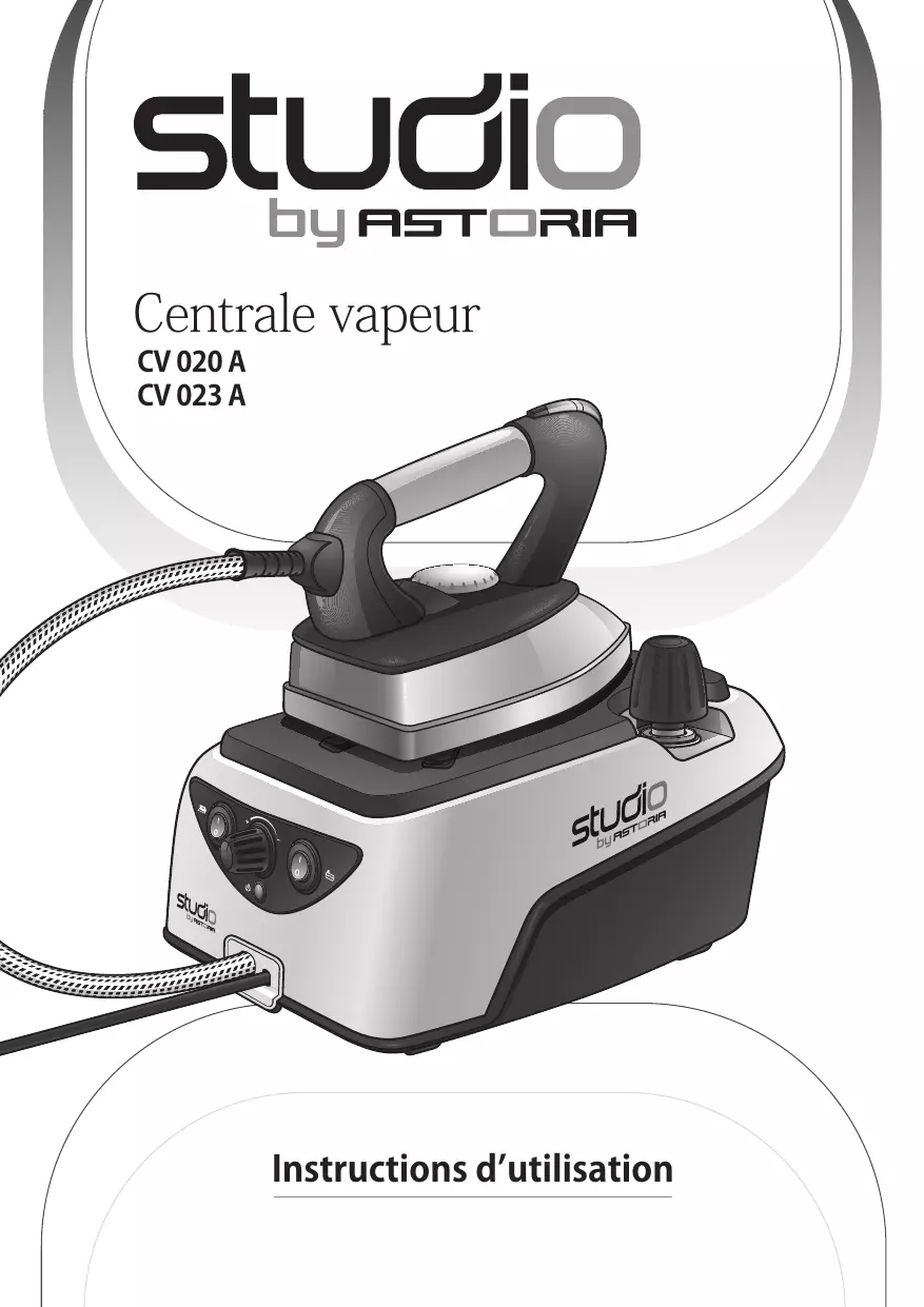 Centrale vapeur CV 020 A CV 023 A Instructions d’utilisation Nous vous demandons de lire très attentivement les instructions données dans cette notice, car elles fournissent, entre autres, des informations importantes relatives à la sécurité d’installation, d’utilisation et d’entretien. Gardez votre notice, vous pourriez avoir besoin de vous y référer dans le futur. Avec sa gamme STUDIO by Astoria, Astoria a mis tout son savoir-faire dans le développement de produits malins, sans compromis sur la qualité. Un design soigné, une compacité parfaitement adaptée à l’esprit contemporain : STUDIO by Astoria, c’est la simplicité alliée à l’efficacité.