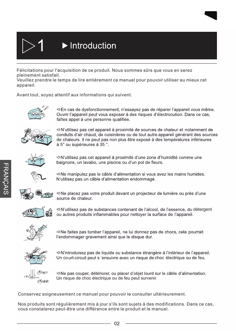 - Spécifications Félicitations pour l'acquisition de ce produit. Nous sommes sûrs que vous en serez pleinement satisfait. Veuillez prendre le temps de lire entièrement ce manuel pour pouvoir utiliser au mieux cet appareil. Avant tout, soyez attentif aux informations qui suivent. détergent risque de choc électrique ou de feu peut survenir. Conservez soigneusement ce manuel pour pouvoir le consulter ultérieurement. Nos produits sont régulièrement mis à jour s'ils sont sujets à des modifications. Dans ce cas, vous constaterez peut-être une différence entre le produit et le manuel. p. 36