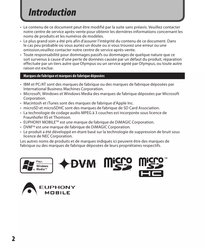 - Toute responsabilité pour dommages passifs ou dommages de quelque nature que ce soit survenus à cause d’une perte de données causée par un défaut du produit, réparation effectuée par un tiers autre que Olympus ou un service agréé par Olympus, ou toute autre raison est exclue. Marques de fabrique et marques de fabrique déposées