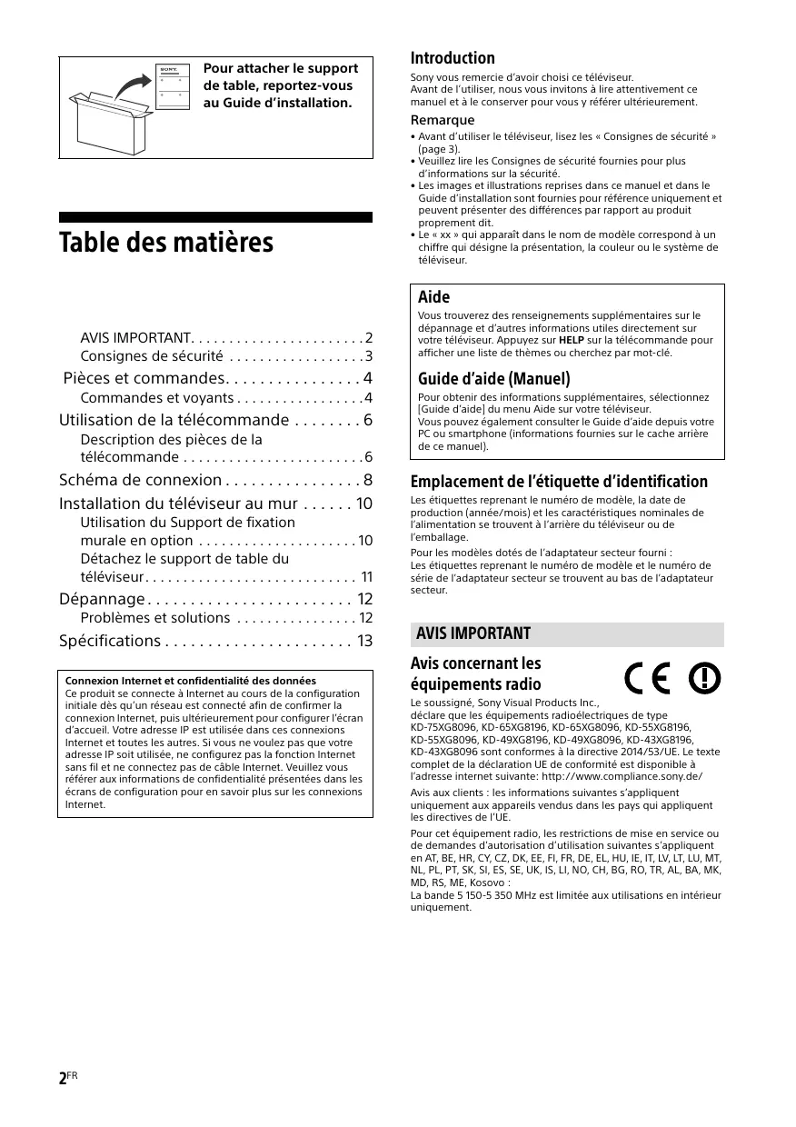 équipements radio Le soussigné, Sony Visual Products Inc., déclare que les équipements radioélectriques de type KD-75XG8096, KD-65XG8196, KD-65XG8096, KD-55XG8196, KD-55XG8096, KD-49XG8196, KD-49XG8096, KD-43XG8196, KD-43XG8096 sont conformes à la directive 2014/53/UE. Le texte complet de la déclaration UE de conformité est disponible à l’adresse internet suivante: http://www.compliance.sony.de/ Avis aux clients : les informations suivantes s’appliquent uniquement aux appareils vendus dans les pays qui appliquent les directives de l’UE. Pour cet équipement radio, les restrictions de mise en service ou de demandes d’autorisation d’utilisation suivantes s’appliquent en AT, BE, HR, CY, CZ, DK, EE, FI, FR, DE, EL, HU, IE, IT, LV, LT, LU, MT, NL, PL, PT, SK, SI, ES, SE, UK, IS, LI, NO, CH, BG, RO, TR, AL, BA, MK, MD, RS, ME, Kosovo : La bande 5 150-5 350 MHz est limitée aux utilisations en intérieur uniquement. Installation/Mise en place Installez et utilisez le téléviseur conformément aux instructions ci-dessous afin d’éviter tout risque d’incendie, d’électrocution ou autre dommage et/ou blessure.