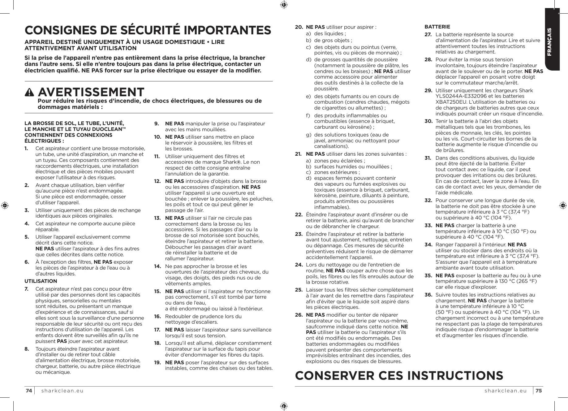 2. L’usure normale de certains composants, comme la barre porte-brosse, le fusible, la courroie, les batteries, le tuyau, etc. 3. Les dommages accidentels, les défauts causés par des négligences, un manque d’entretien, une mauvaise utilisation ou une manipulation inappropriée de l’aspirateur ; soit toute utilisation non conforme à la Notice d’utilisation Shark fournie avec votre appareil.