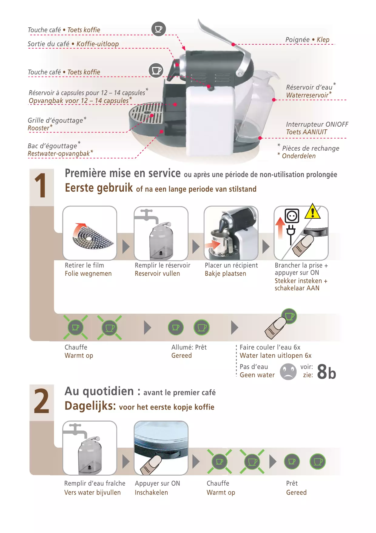 - Onderdelen Première mise en service ou après une période de non-utilisation prolongée Eerste gebruik of na een lange periode van stilstand Retirer le film Folie wegnemen Chauffe Warmt op Remplir le réservoir Reservoir vullen Placer un récipient Bakje plaatsen Allumé: Prêt Gereed Faire couler l’eau 6x Water laten uitlopen 6x Pas d’eau Geen water