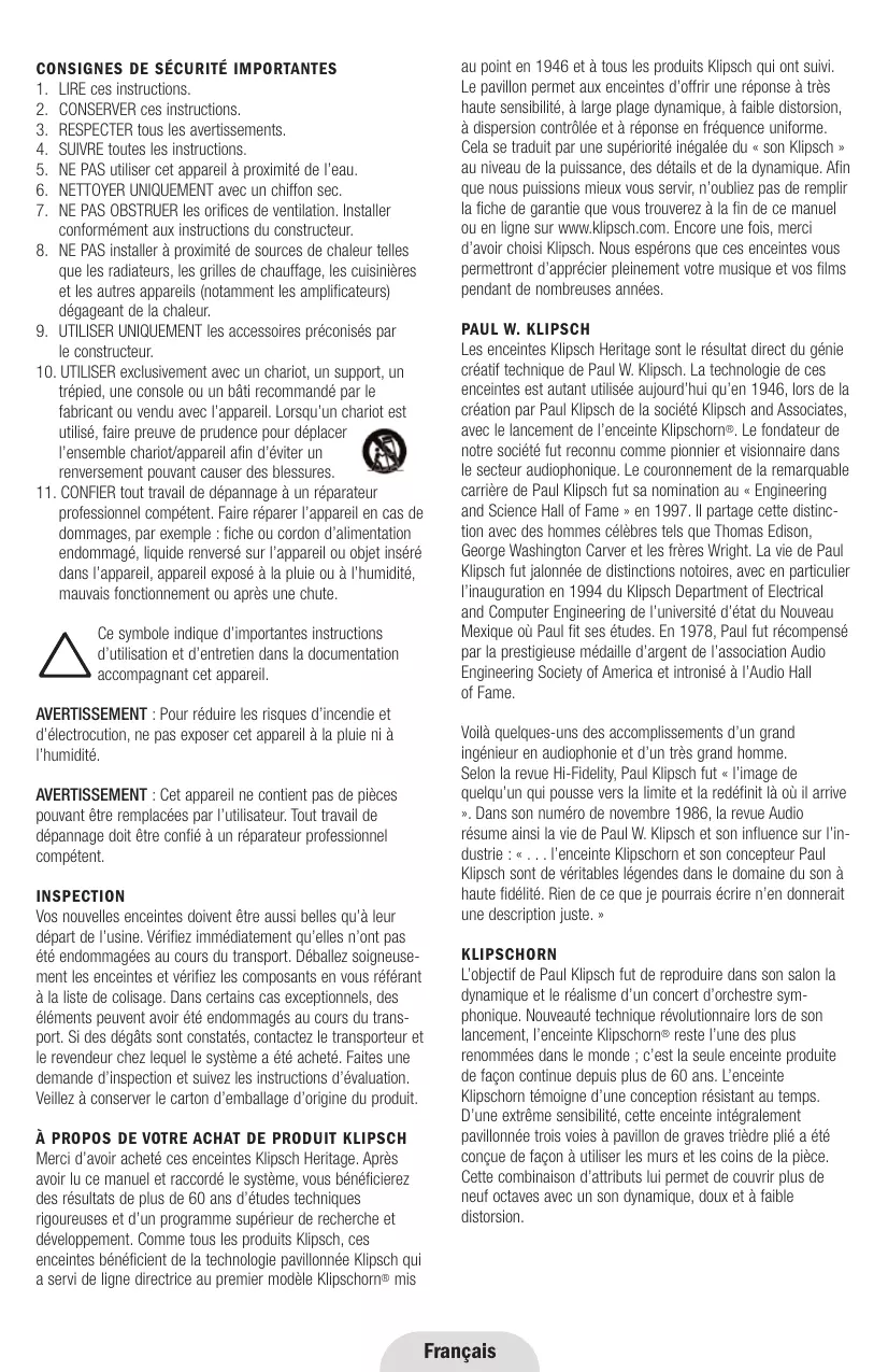 Merci d'avoir acheté ces enceintes Klipsch Heritage. Après avoir lu ce manuel et raccordé le système, vous bénéficierez des résultats de plus de 60 ans d'études techniques rigoureuses et d'un programme supérieur de recherche et développement. Comme tous les produits Klipsch, ces enceintes bénéficient de la technologie pavillonnée Klipsch qui a servi de ligne directrice au premier modèle Klipschorn mis