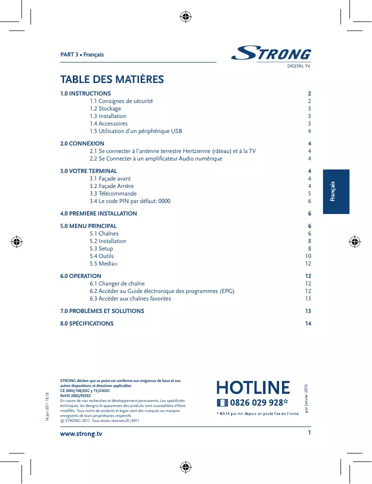 ppuyer sur OK et sélectionner votre chaîne favorite à l’aide des touchespq. Il peut y avoir différentes raisons au dysfonctionnement du terminal. Si vous rencontrez des problèmes avec ce récepteur ou son installation, veuillez tout d'abord lire attentivement les paragraphes appropriés de ce Manuel d'Utilisation et cette section “Problèmes & Solutions”. Si le terminal ne fonctionne pas après vérification contacter votre revendeur ou la Hotline. Ne pas ouvrir le capot du terminal, cela peut engendrer une situation à risque et entraînera la perte de la garantie. Problème Cause Solution Lumière de veille non allumée Câble principal débranché Contrôler le branchement Aucun signal trouvé L’antenne est débranchée L’antenne est endommagée ou mal orientée Hors de portée du signal numérique L’antenne active doit être activée Vérifier le câble de l’antenne Vérifier l’antenne Vérifier la couverture du signal numérique auprès de votre revendeur Allumer l’antenne active Aucune Image/ Aucun Son sur TV/ VCR** Péritel/ AV* n’est pas sélectionné sur votre TV La TV n’est pas allumé Sélectionner la bonne sortie TV Allumez la TV Message Chaîne cryptée Chaîne à accès payant Sélectionner une autre chaîne Aucune réponse aux ordres de la télécommande Le terminal est éteint La télécommande n’est pas correctement dirigée Il y a un obstacle barrant le signal entre la télécommande et la TV Les piles sont trop faibles Allumer le récepteur Diriger la télécommande vers le terminal Vérifier qu’il n’y a pas d’obstacle Changer les piles de la télécommande Vous avez oublié le code de verrouillage du Menu Plus de réception numérique après déplacement du récepteur dans une autre pièce. Contacter la hot line ou envoyer un email vers notre équipe support via www.strong.tv Le signal numérique reçu par le récepteur est trop faible. Essayer une alimentation directe depuis l’antenne