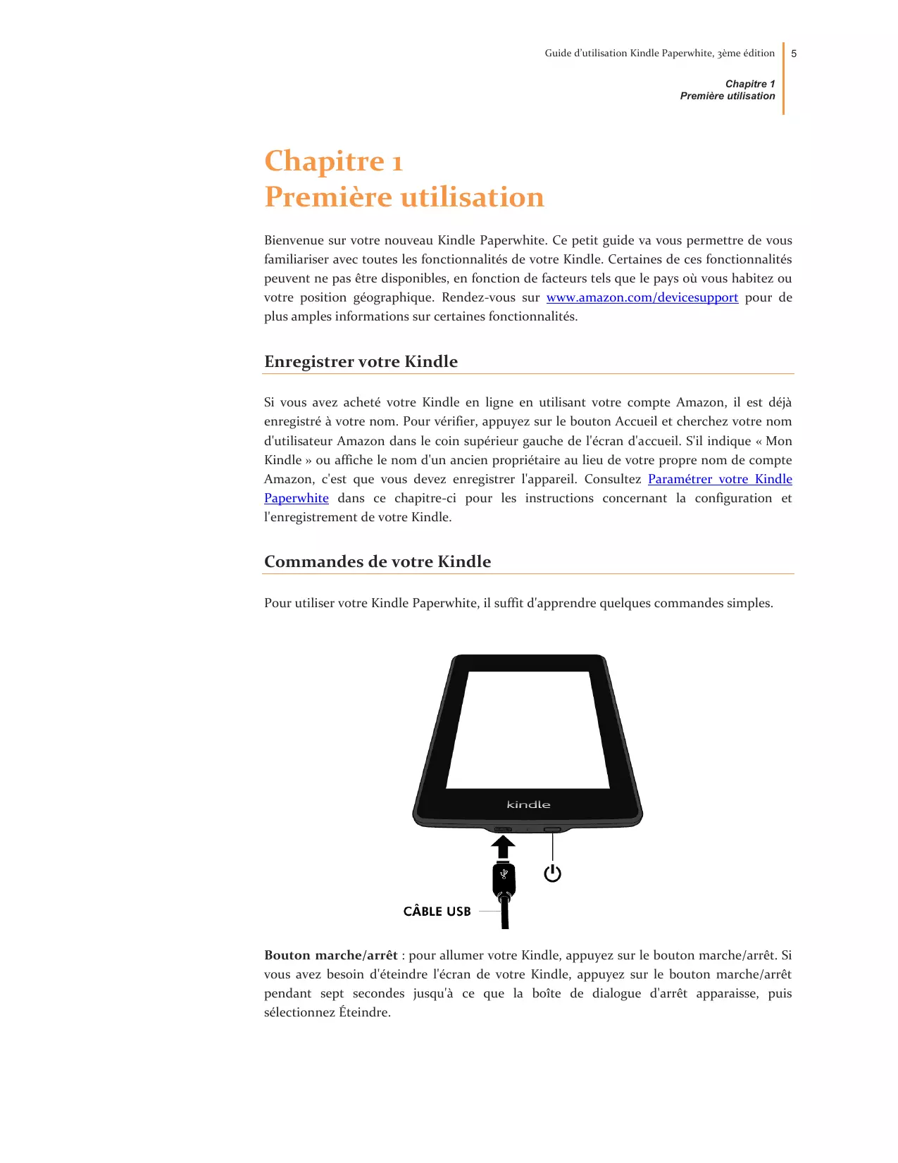 Bienvenue sur votre nouveau Kindle Paperwhite. Ce petit guide va vous permettre de vous familiariser avec toutes les fonctionnalités de votre Kindle. Certaines de ces fonctionnalités peuvent ne pas être disponibles, en fonction de facteurs tels que le pays où vous habitez ou leur position géographique. Rendez-vous sur www.amazon.com/devicesupport pour de plus amples informations sur certaines fonctionnalités.