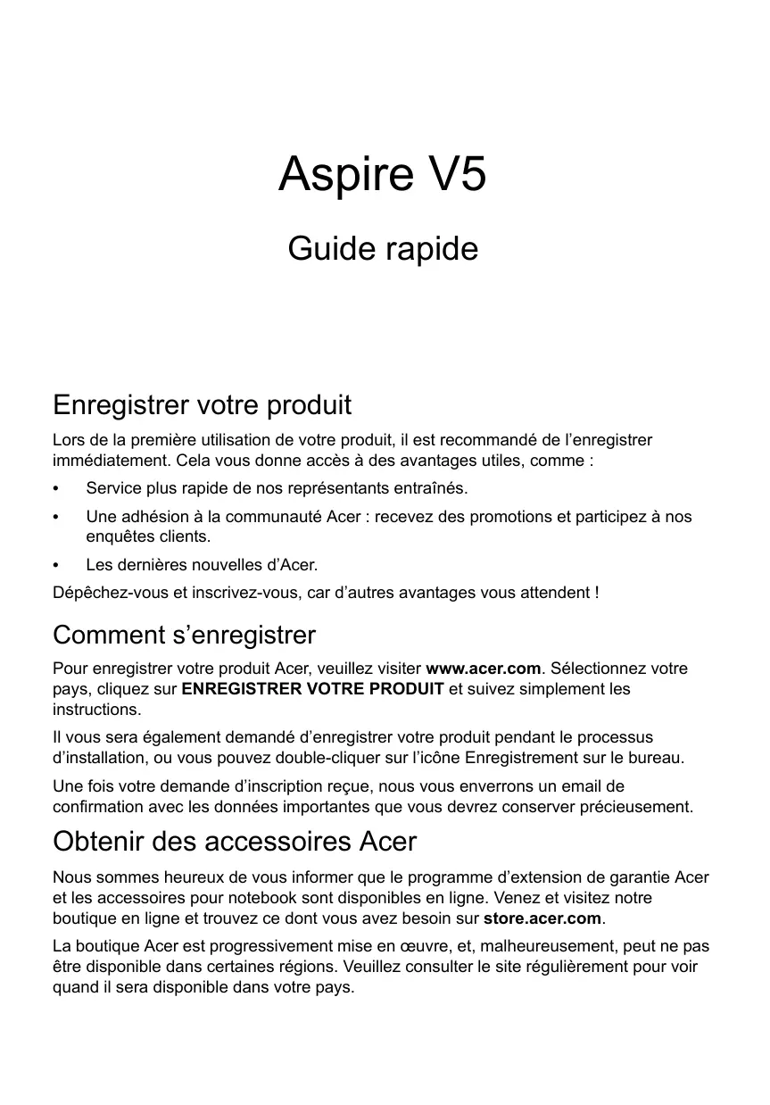Les dernières nouvelles d’Acer. Dépêchez-vous et inscrivez-vous, car d’autres avantages vous attendent ! Comment s’enregistrer Pour enregistrer votre produit Acer, veuillez visiter www.acer.com. Sélectionnez votre pays, cliquez sur ENREGISTRER VOTRE PRODUIT et suivez simplement les instructions. Il vous sera également demandé d’enregistrer votre produit pendant le processus d’installation, ou vous pouvez double-cliquer sur l’icône Enregistrement sur le bureau. Une fois votre demande d’inscription reçue, nous vous enverrons un email de confirmation avec les données importantes que vous devrez conserver précieusement. Obtenir des accessoires Acer Nous sommes heureux de vous informer que le programme d’extension de garantie Acer et les accessoires pour notebook sont disponibles en ligne. Venez et visitez notre boutique en ligne et trouvez ce dont vous avez besoin sur store.acer.com. La boutique Acer est progressivement mise en œuvre, et, malheureusement, peut ne pas être disponible dans certaines régions. Veuillez consulter le site régulièrement pour voir quand il sera disponible dans votre pays. © 2012 Tous droits réservés. Guide rapide de Aspire V5 Cette révision : 12/2012 Modèle : ______________________________________ No. de série : __________________________________ Date d’achat : _________________________________ Lieu d’achat : __________________________________