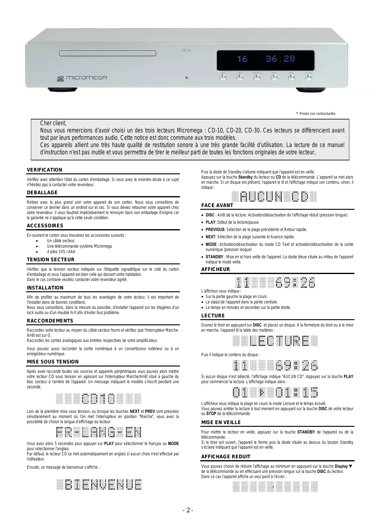 - Photos non contractuelles Cher client, Nous vous remercions d’avoir choisi un des trois lecteurs Micromega : CD-10, CD-20, CD-30. Ces lecteurs se différencient avant tout par leurs performances audio. Cette notice est donc commune aux trois modèles. Ces appareils allient une très haute qualité de restitution sonore à une très grande facilité d’utilisation. La lecture de ce manuel d’instruction n’est pas inutile et vous permettra de tirer le meilleur parti de toutes les fonctions originales de votre lecteur. VERIFICATION Puis la diode de Standby s’allume indiquant que l’appareil est en veille. Appuyez sur la touche Standby du lecteur ou CD de la télécommande. L’appareil se met alors en marche. Si un disque est présent, l’appareil le lit et l'affichage indique son contenu, sinon, il indique : Vérifiez avec attention l’état du carton d’emballage. Si vous avez le moindre doute à ce sujet n’hésitez pas à contacter votre revendeur. DEBALLAGE Retirez avec le plus grand soin votre appareil de son carton. Nous vous conseillons de conserver ce dernier dans un endroit sur et sec. Si vous deviez retourner votre appareil chez votre revendeur, il vous faudrait impérativement le renvoyer dans son emballage d’origine car la garantie ne s’applique qu’à cette seule condition. FACE AVANT